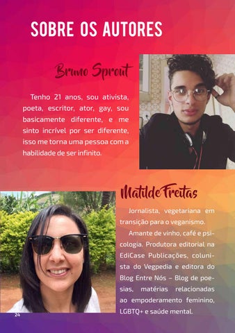 Sobre os autores Bruno Sprout Tenho 21 anos, sou ativista, poeta, escritor, ator, gay, sou basicamente diferente, e me sinto incrível por ser diferente, isso me torna uma pessoa com a habilidade de ser infinito.