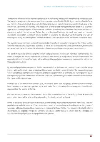 Therefore we decided to revise the management plan on wolf taking in to account of the findings of the evaluation. The revised management plan was prepared in cooperation by the Finnish Wildlife Agency and the Finnish Game and Fisheries Research Institute (currently, the Natural Resources Institute Finland) under the leadership of the Ministry of Agriculture and Forestry. The preparation of the revised management plan relied on a pragmatic approach to planning. The point of departure was problem-centred interaction between the game administration, researchers and civil society actors. Rather than one-directional hearings, the work was based on concrete discussions, cooperation and search for and creation of solutions. The objective was formulating new ways of thinking and acting that would permit a more harmonious coexistence of humans and wolves in the same areas. The revised management plan contains the general objectives of wolf population management in Finland and the concrete measures and project ideas by means of which the civil society, the game administration, the research sector and even the wolf itself can be winners in collaborative population management in each territory. The point of departure for managing the Finnish wolf population is focusing on individual wolf territories. This means that targets are set and measures are planned for each individual wolf pack and territory. The concerns and needs of residents in the wolf territories will be addressed by population management measures that will not put the pack’s viability at risk. By means of population management that focuses on individual territories and cooperation groups to be set up in areas with wolf territories, local residents will be provided possibilities for participation. The cooperation groups will be tasked to assess the local wolf situation and to discuss prevention of problems and hunting carried out to manage the population. Coexistence will also be promoted by intervening in the behaviour of individual wolves that cause problems or damage. On the basis of this revised management plan, we initiated a two year trial project allowing the management based hunting on wolves from specified viable wolf packs. The continuation of the management based hunt is dependent on the success of the trial. Our main aim is to achieve and then maintain a favourable conservation status of the wolf population. A favourable conservation status will be achieved by safeguarding the viability of each wolf pack. Efforts to achieve a favourable conservation status in Finland by means of strict protection have failed. The wolf population can only be protected if the concerns and needs of humans living and working in the living areas of wolves are addressed by population management measures. We hope that the new focus on individual territories of wolf packs and on people living in the same area will provide a better change to achieve both the ecological and social sustainability of policy on wolf population management.