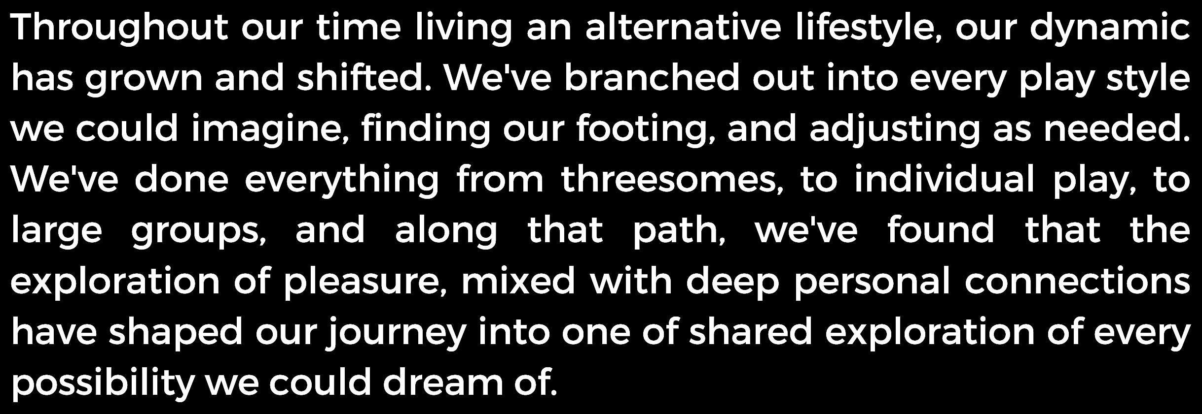 We've been in the lifestyle for just over two years, and in this time, we've jumped headfirst into discovering what really drives our desires and our fantasies. Our attraction to it started as soon as we began researching the community and found a group that was welcoming of forging a different path One that embraced every person's unique attributes.