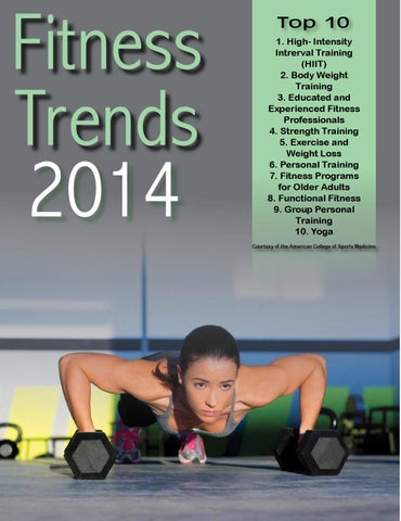 Top 10 1. High- Intensity Intrerval Training (HIIT) 2. Body Weight Training 3. Educated and Experienced Fitness Professionals 4. Strength Training 5. Exercise and Weight Loss 6. Personal Training 7. Fitness Programs for Older Adults 8. Functional Fitness 9. Group Personal Training 10. Yoga Courtesy of the American College of Sports Medicine
