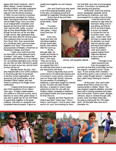 quality time together we can’t always Our first kids’ race was so encouraging have.” and fun. From there, my interest just John and Grant have also spent kept growing and growing.” a lot of time playing baseball, going At the time, Grant was playing to the lake, and playing airsoft and soccer, basketball, baseball, tennis paintball at Legendary Shooting Sports. and training for triathlons, and John “Some days it has just been encouraged him to make a hard choice. me and Dad playing “I told him that he had all the fields,” Grant reached an age when he says. had been doing a lot of “I’ve been everything, but that for killed over and over,” him to do what it takes John jokes. “I have to excel, he needed more lives than 20 to choose the one he cats!” loved the most,” John Even now, says. “Larkin and I told Grant and John will him that no matter what ride bikes together, he decided, we would though Grant often help him get the right leaves John behind technique and help him after the warm-up. hone his abilities.” “As the John and Larkin’s kids get older, it’s support helped Grant harder and harder to make the decision schedule time with to focus solely on them,” John says. triathlons. Johnny, with daughter Natalie “They are so busy, “I thought it was and so involved, and really awesome that we support that, but I they encouraged me do miss the times when it was easier to and told me that they would help me find just spend time with them.” the support I needed to excel,” Grant Grant is especially busy as he says. “It was exactly what I needed. I works hard in his advanced classes and loved all the sports I was involved in, but is involved in cross country, track and when I really thought about it, I realized swim at Texas High School. However, that I didn’t enjoy training for most of his true passion is competing in them.” triathlons; a sport that caught his interest At this point, John and Larkin at only 10 years old when Kirsten helped Grant find a coach at a new McCown, a student in Grant’s class, training facility in Dallas: Playtri. The asked him to train for one with her. new program supports athletes, provides Kirsten’s father competed in triathlons, them with a training schedule and helps and helped Kirsten and Grant prepare them find events. Grant’s coach, Morgan for their first one. Johnson, stays in contact through calls, “I agreed, and then figured out emails, texts and helps Grant stay what it was later!” Grant says. “Once I focused on training for the 750 meter tried it, I just loved it. I love to swim, bike swim, 20 kilometer bike race and 5 and to run, and I love training for them. kilometer run.