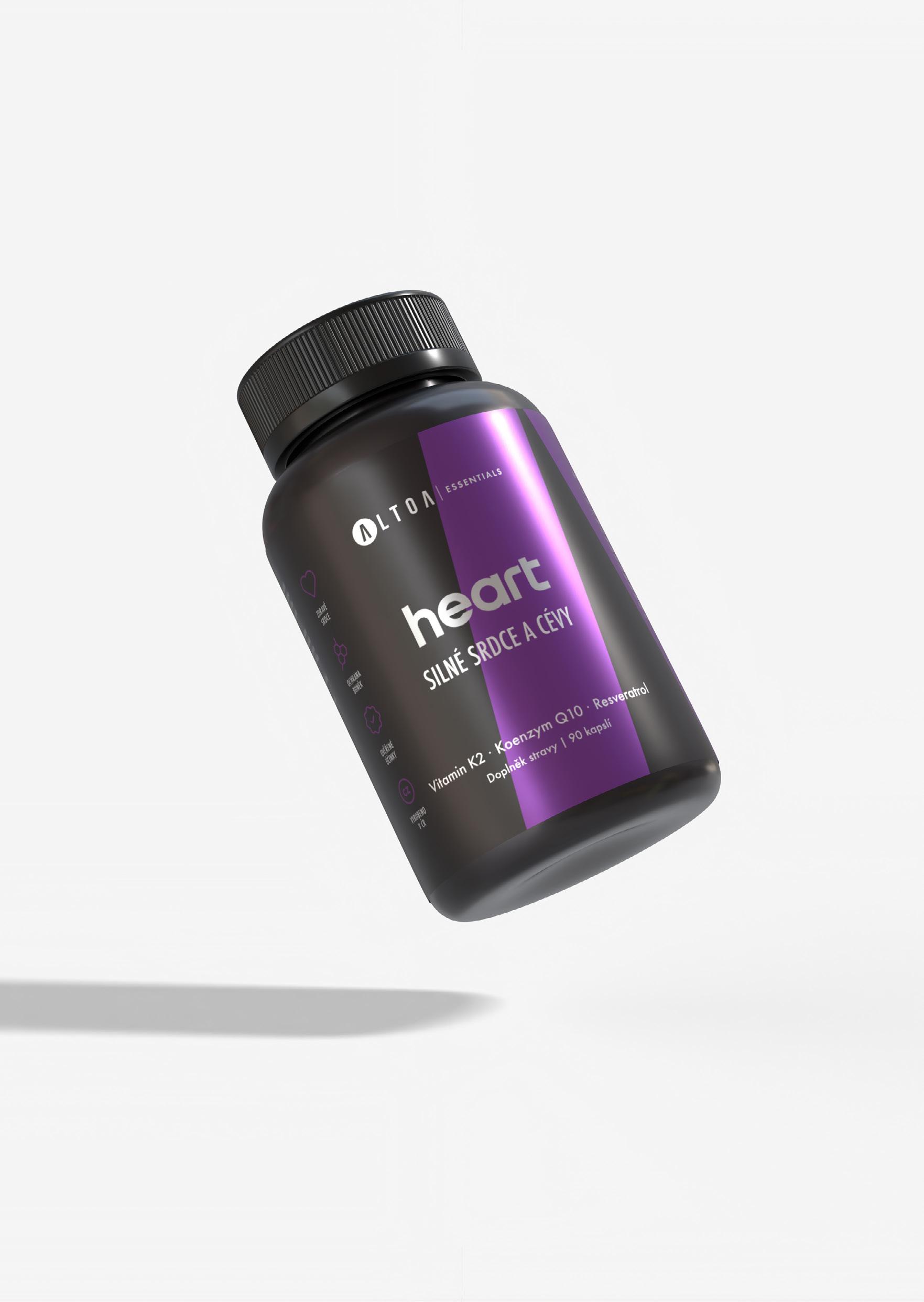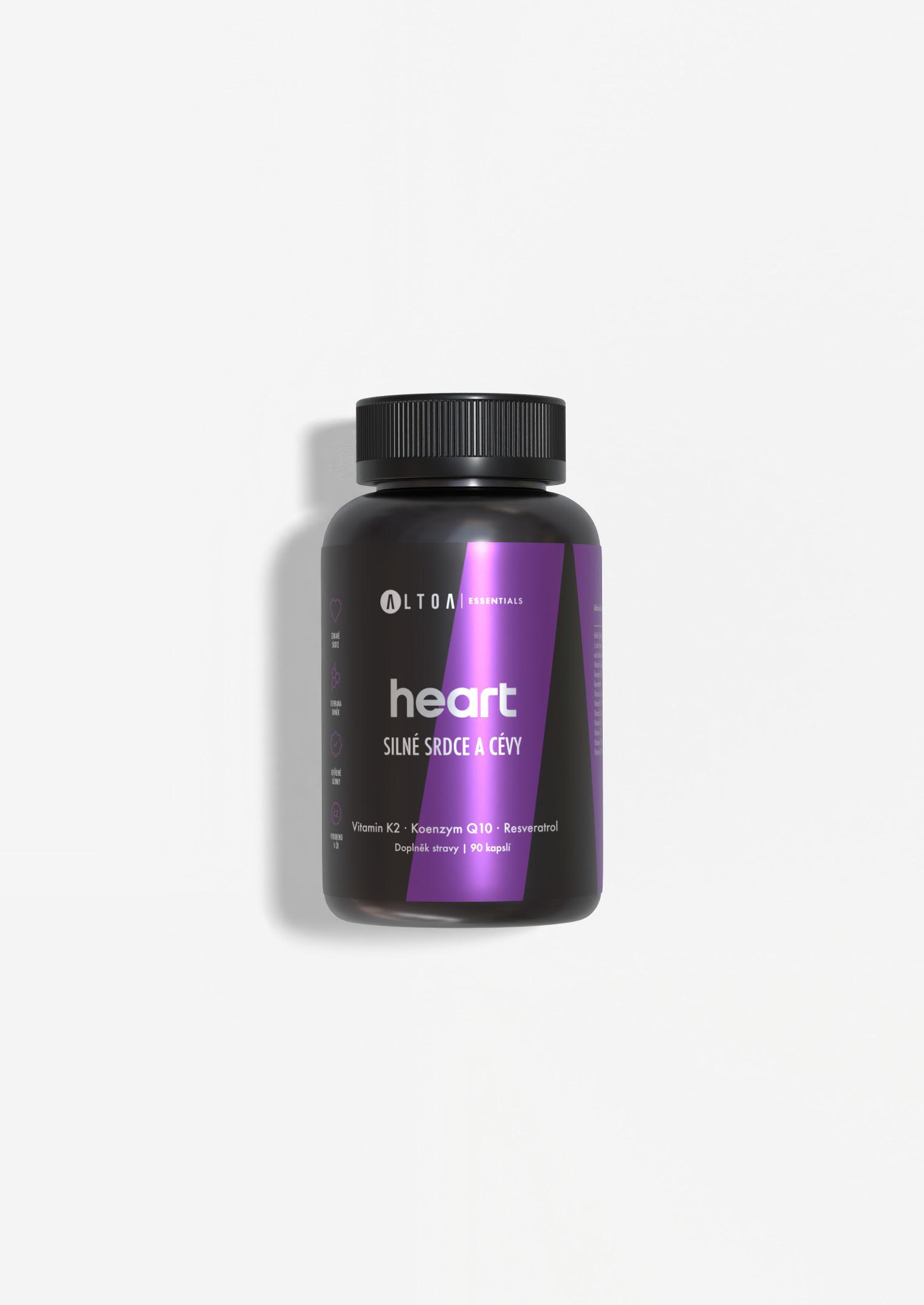 Heart kombinuje resveratrol a koenzym Q10, vitaminy K2, D3, C, E, hořčík a vitaminy skupiny B, které společně podporují zdraví srdce a cév, chrání buňky před oxidačním stresem, posilují imunitu a přispívají k celkové energii, vitalitě a správnému fungování nervového systému.