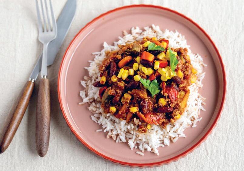 Dit Mexicaans stoofpotje combineert verse groenten, rode kidney bonen en plantaardig gehakt in een kruidige, zachte saus met een zuiders karakter. Geserveerd met basmatirijst voor een vullende, maar lichte maaltijd.