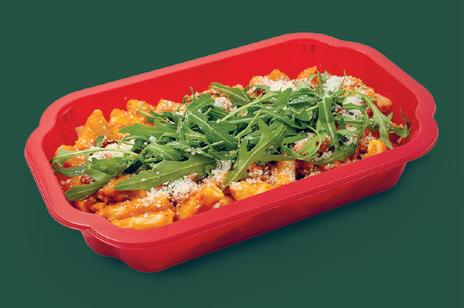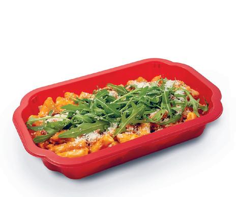 Rigatoni fraîches dans une sauce onctueuse à la tomate et au mascarpone, accompagnées de poulet tendre et de légumes grillés. Garnies de roque e fraîche et de parmesan pour ce e parfaite touche italienne.