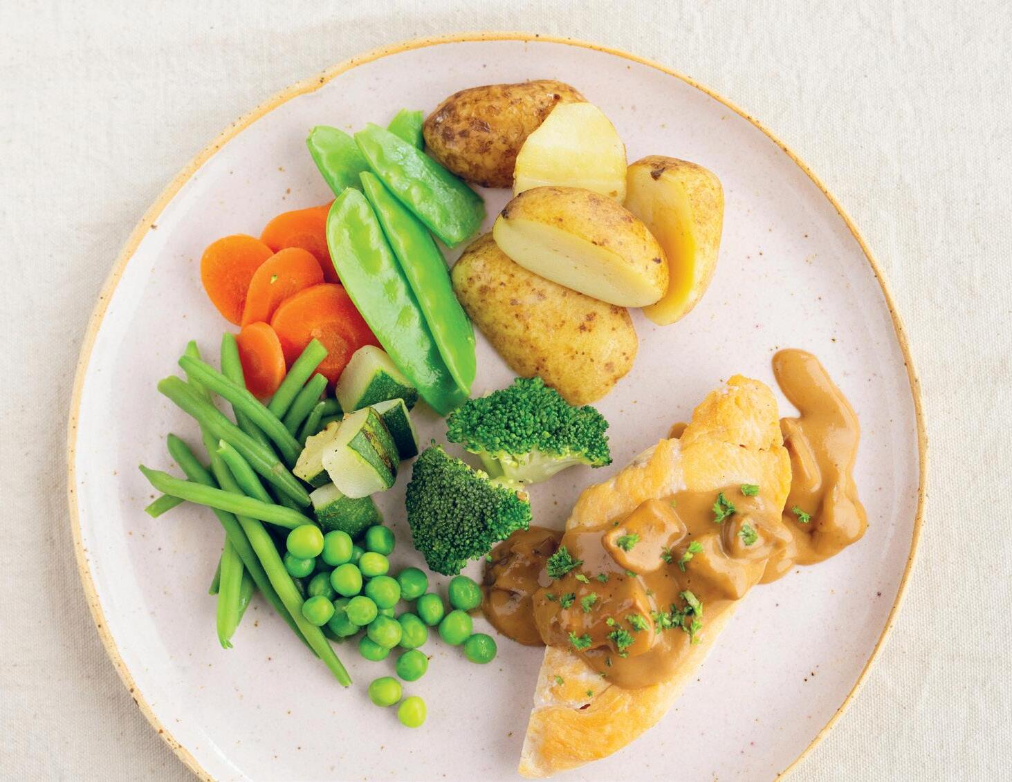 Filet de poulet tendre dans une sauce crémeuse aux champignons avec des champignons de Paris poêlés, un mélange ra iné de légumes: brocoli, caro e, courge e, pois gourmands, haricots et petits pois, et servi avec des pommes de terre en chemise.
