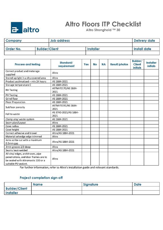 Use these ITPs to keep your project running smoothly and safely. If you have any questions, please contact Altro’s technical team.