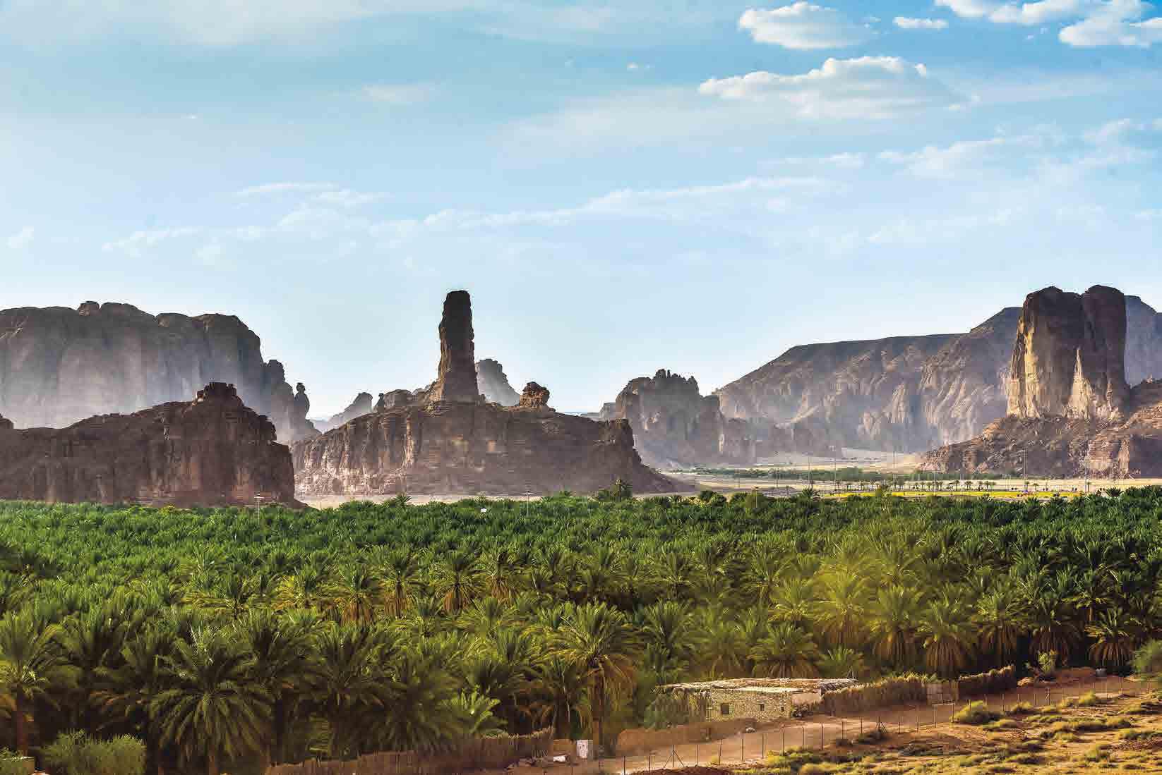 gazelles and more exotic flora and fauna thrive. A lush oasis also thrives, green canopies of a palm grove offer coolness and shelter, and the air is perfumed with the scent of dates, orange, and mint. This oasis is the heart of AlUla, and has nourished life here for millennia, inviting people to settle here and develop their rich and varied cultures.