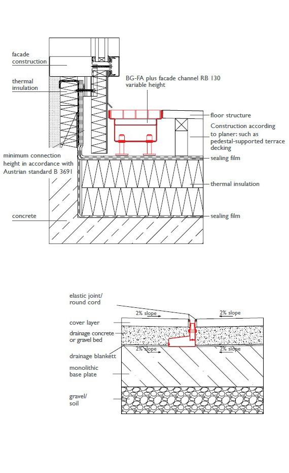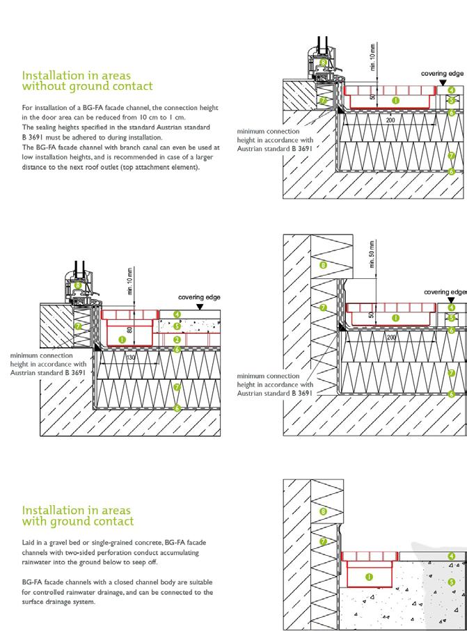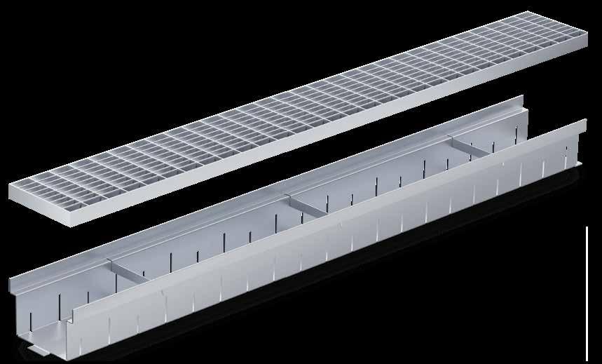 Laid in a gravel bed or single-grained concrete, chan nels with two-sided perforation conduct accumulating rainwater into the ground below to seep off. Channels with a closed channel body are suitable for controlled rainwater drainage, and can be connected to the sur face drainage system.