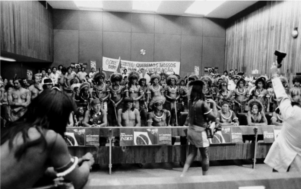 Vigília Indígena no Congresso Nacional para garantir que seus direitos seriam inclusos na constituição (Fonte: Beto Ricardo/ISA 1988)