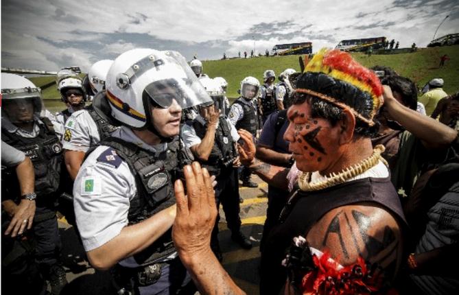Pirakumã Yawalapiti sendo barrado pela Polícia Militar do Distrito Federal, na entrada do Congresso Nacional. Mobilização Nacional Indígena, outubro de 2013.