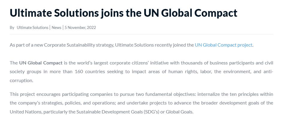 We are beyond happy to have influenced Ultimate Solutions Corp. to join the United Nations Global Compact and commit to working towards a more sustainable and better future. We hope to continue inspiring other companies to join this amazing initiative!