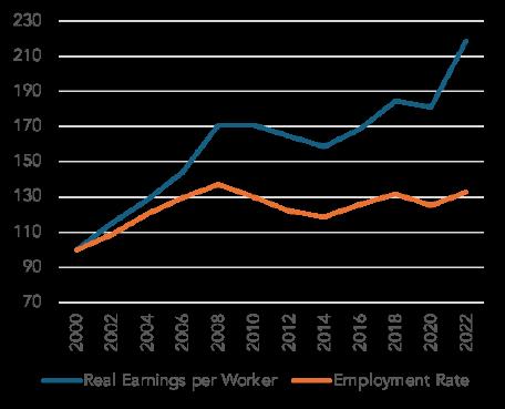 The employment ratio grew until the beginning of the crisis, and since then, it has managed to remain stable, hovering around 130. Both the employment ratio and income evolved together until 2006, where real earnings per worker experienced significant growth, currently doubling the values from the beginning of the period.