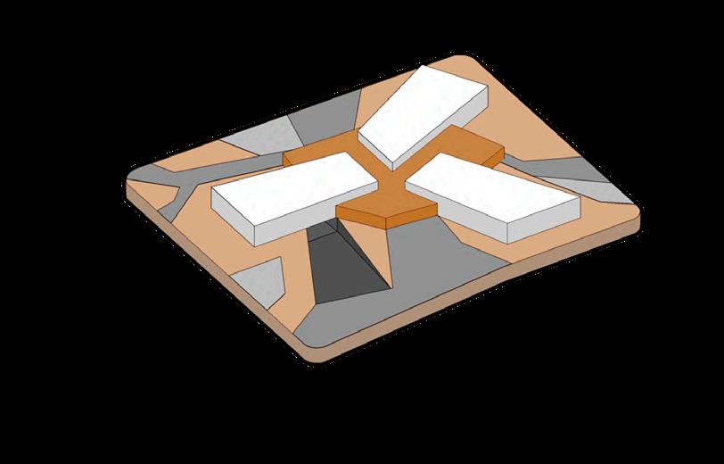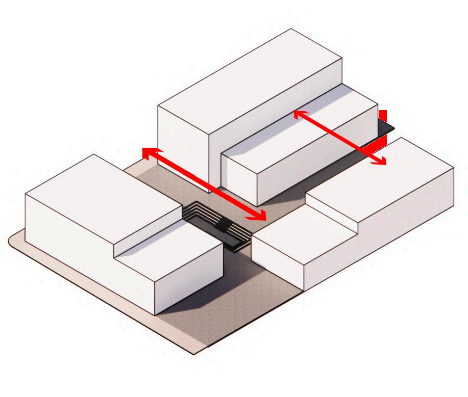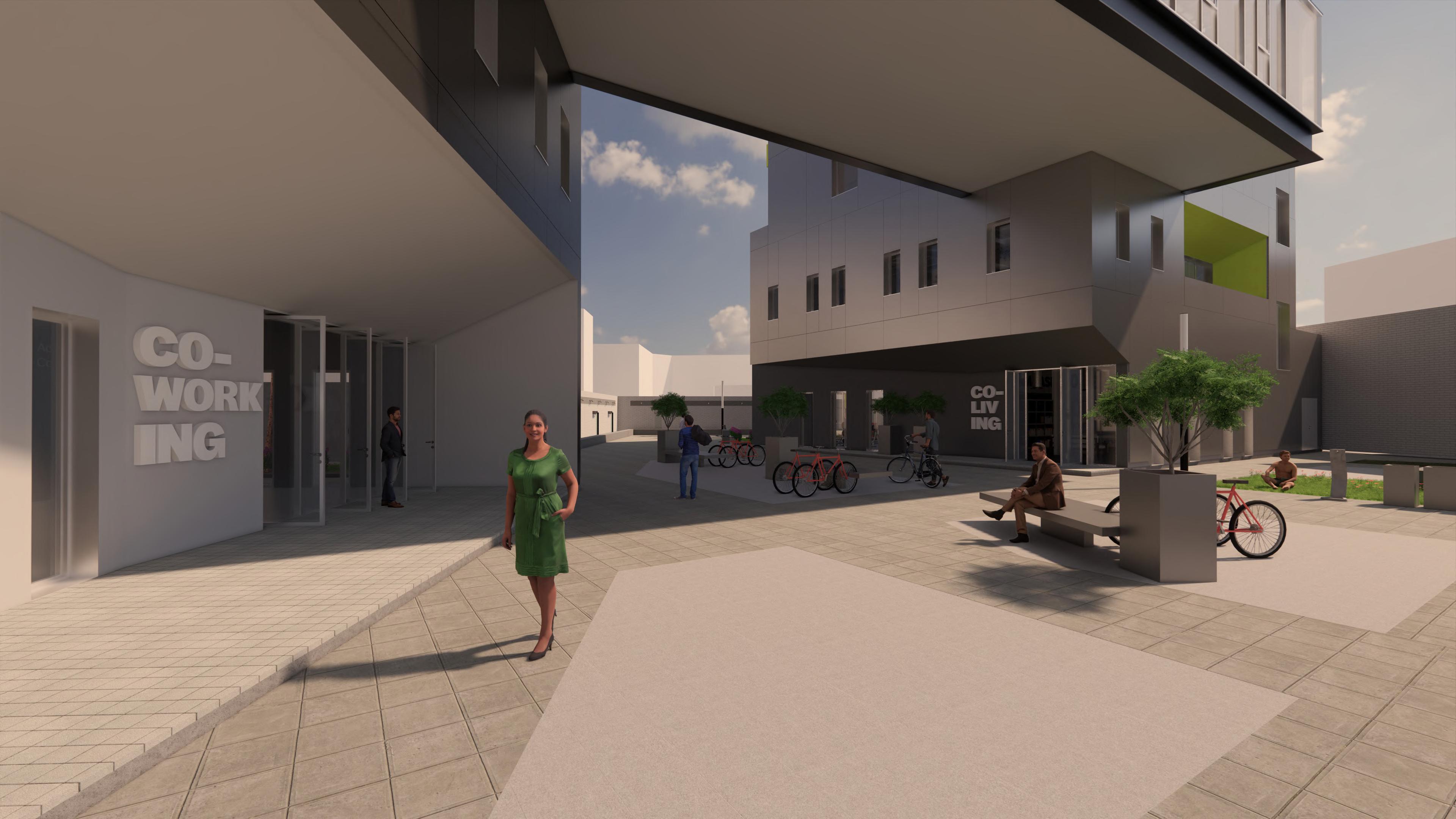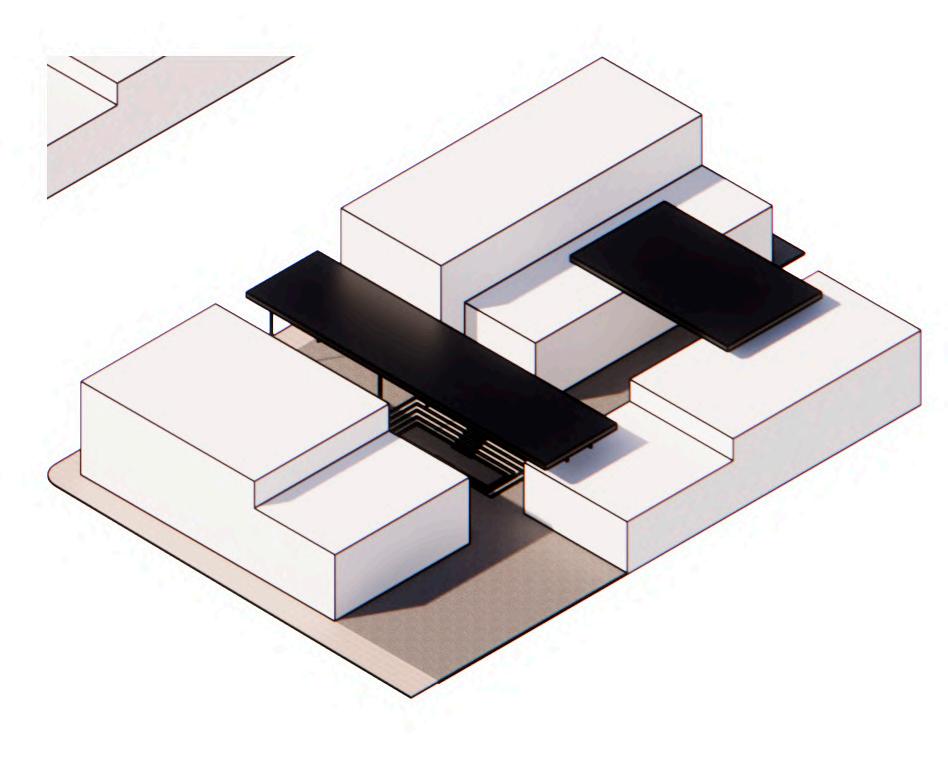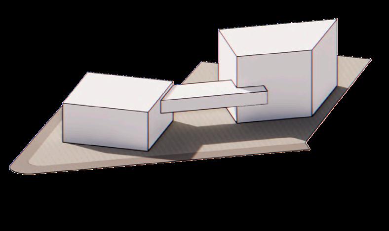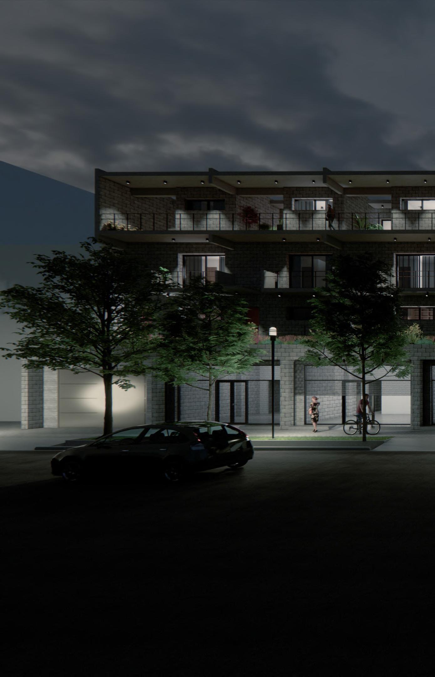Ante la premisa de liberar al terreno de la huella del edificio lo màs posible para ampliar el uso pùblico del espacio exterior, se decide romper con la lìnea de fachadas contìnuas de la calle estableciendo 2 bloques prismàticos exentos de distintas alturas, uno de secciòn cuadrada girado sobre el terreno de forma perpendicular al sol y otro con forma de trapecio rectàngulo paralelo a la lìnea de la calle, que contienen el co-working y el co-living respectivamente. Ambos mantienen la misma materialidad y resoluciòn de detalles de fachada. El nexo entre ambos volùmenes exentos es un puente que los conecta estableciendo un nuevo uso al programa y de caràcter pùblico que es un cafe, posicionandose como un hito para la zona.