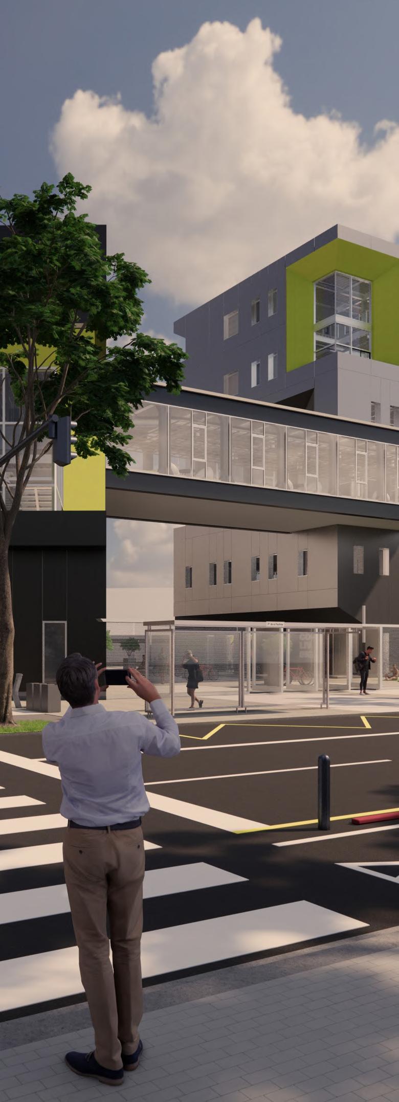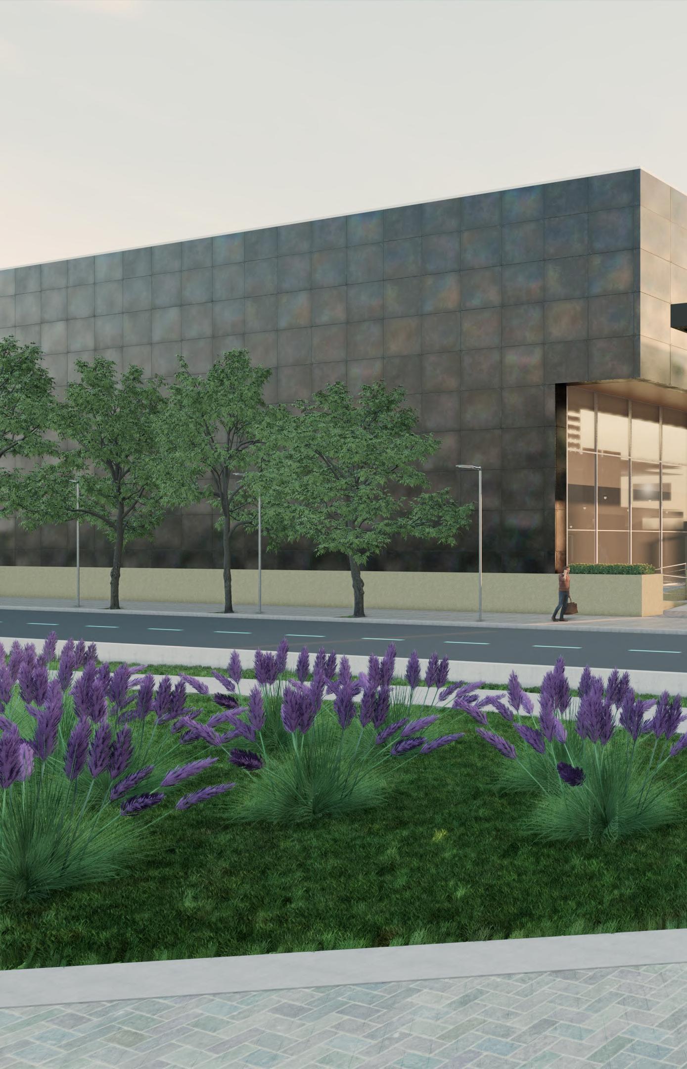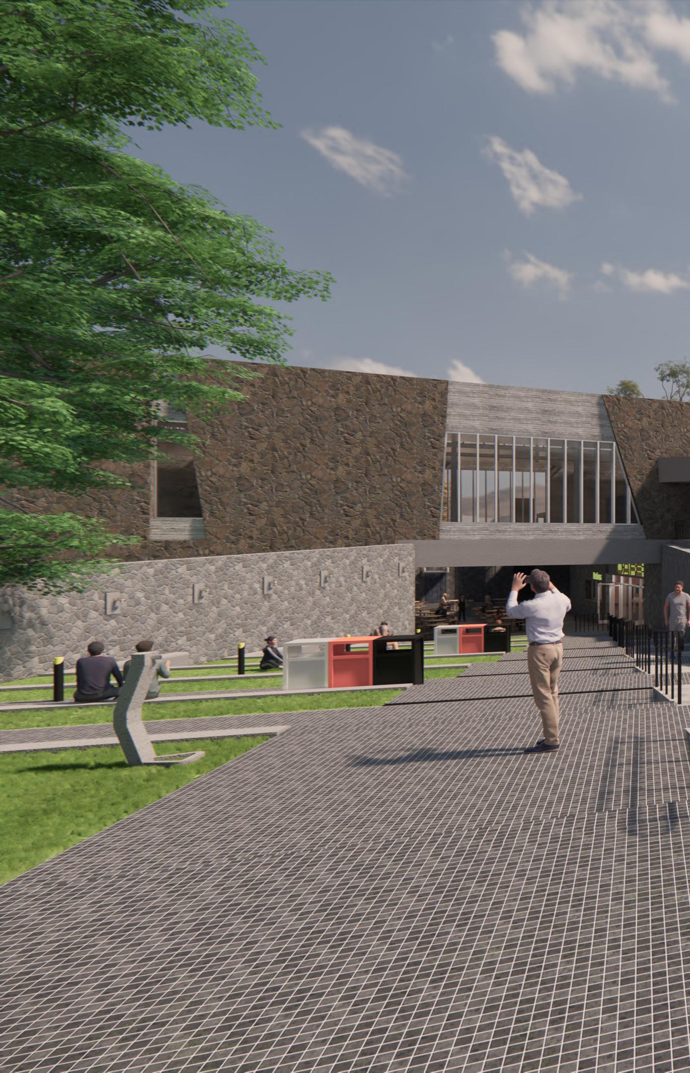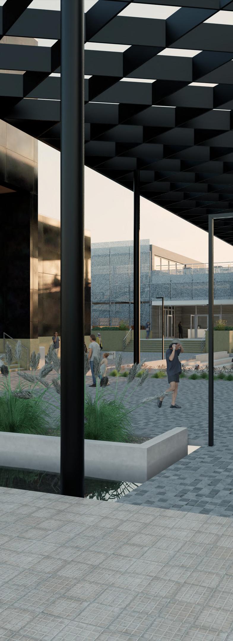 Ante la premisa de liberar al terreno de la huella del edificio lo màs posible para ampliar el uso pùblico del espacio exterior, se decide romper con la lìnea de fachadas contìnuas de la calle estableciendo 2 bloques prismàticos exentos de distintas alturas, uno de secciòn cuadrada girado sobre el terreno de forma perpendicular al sol y otro con forma de trapecio rectàngulo paralelo a la lìnea de la calle, que contienen el co-working y el co-living respectivamente. Ambos mantienen la misma materialidad y resoluciòn de detalles de fachada. El nexo entre ambos volùmenes exentos es un puente que los conecta estableciendo un nuevo uso al programa y de caràcter pùblico que es un cafe, posicionandose como un hito para la zona.