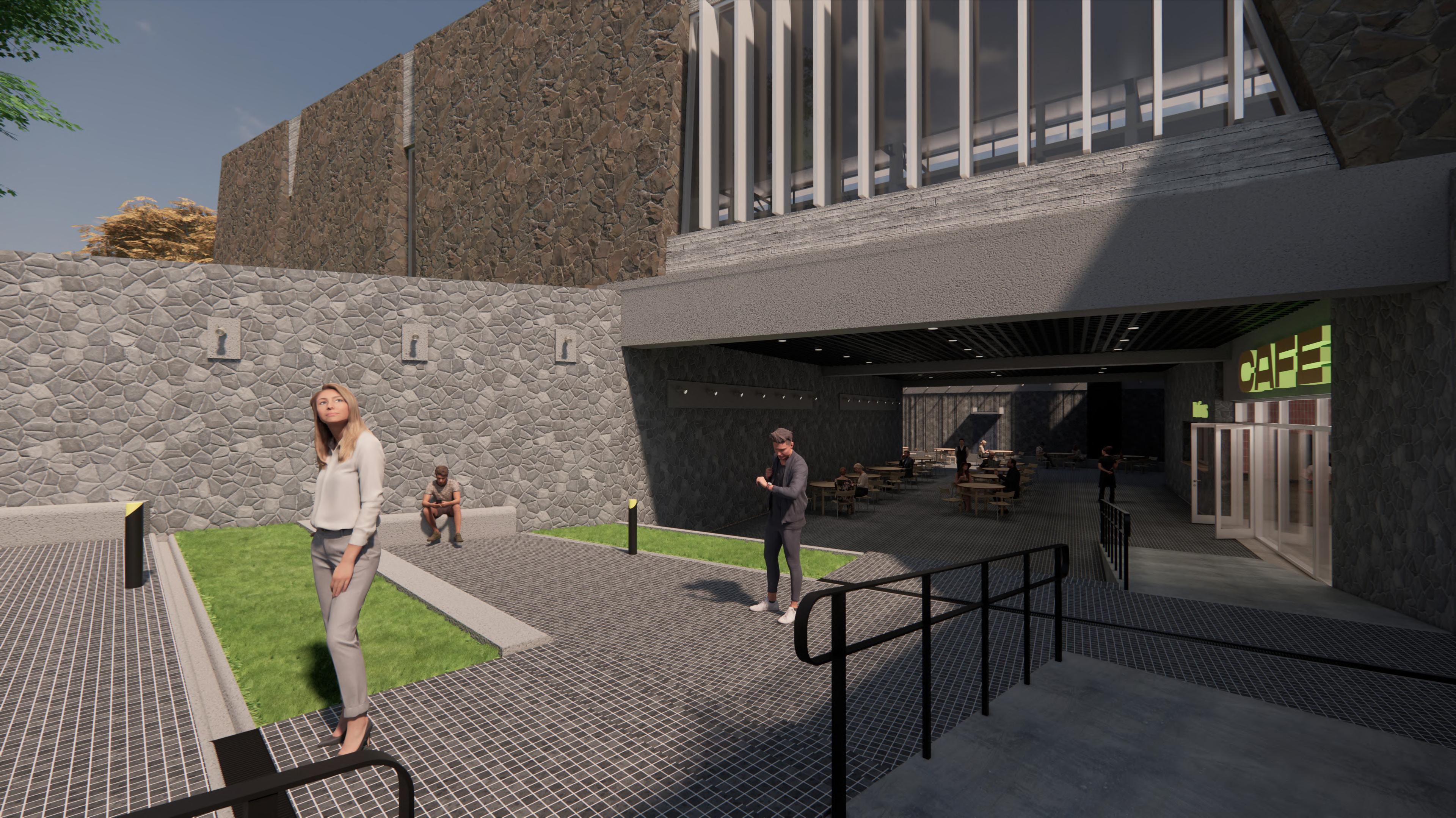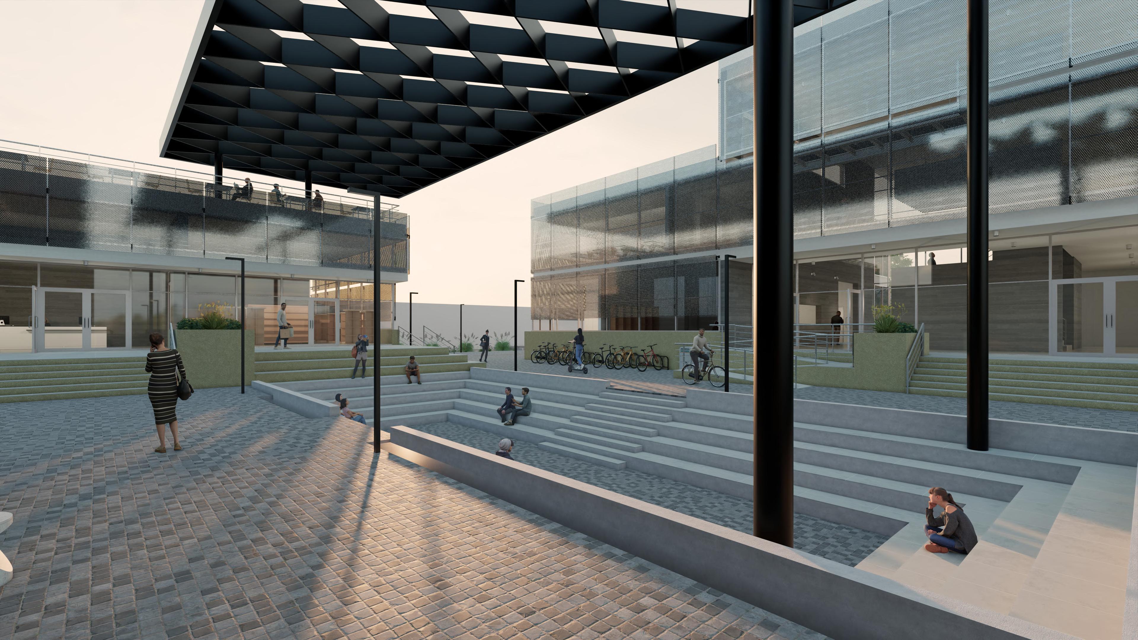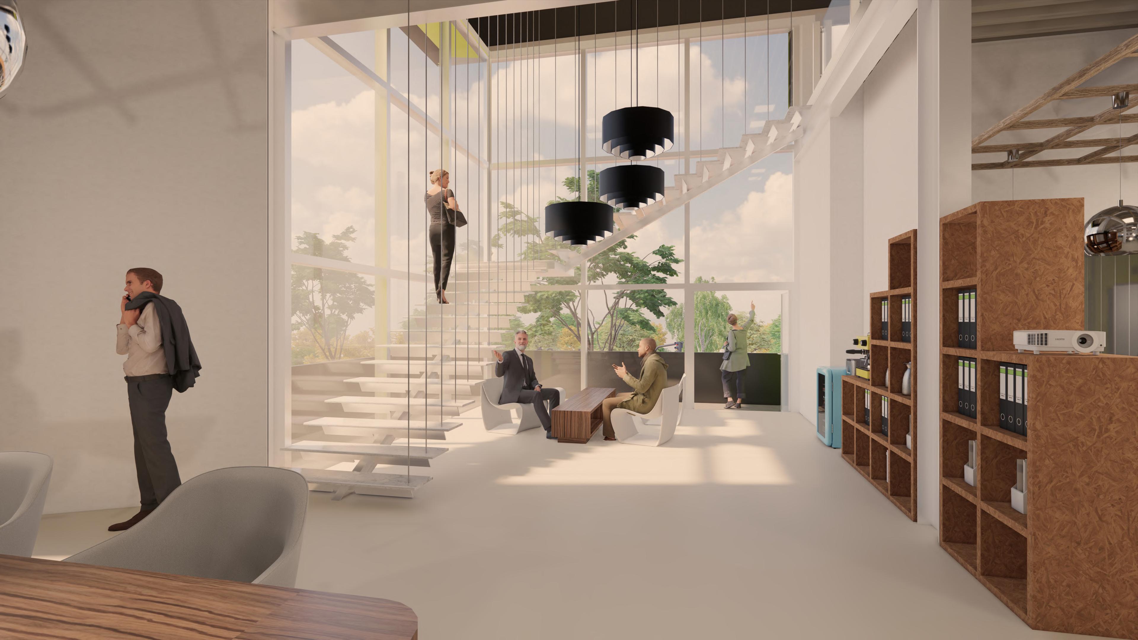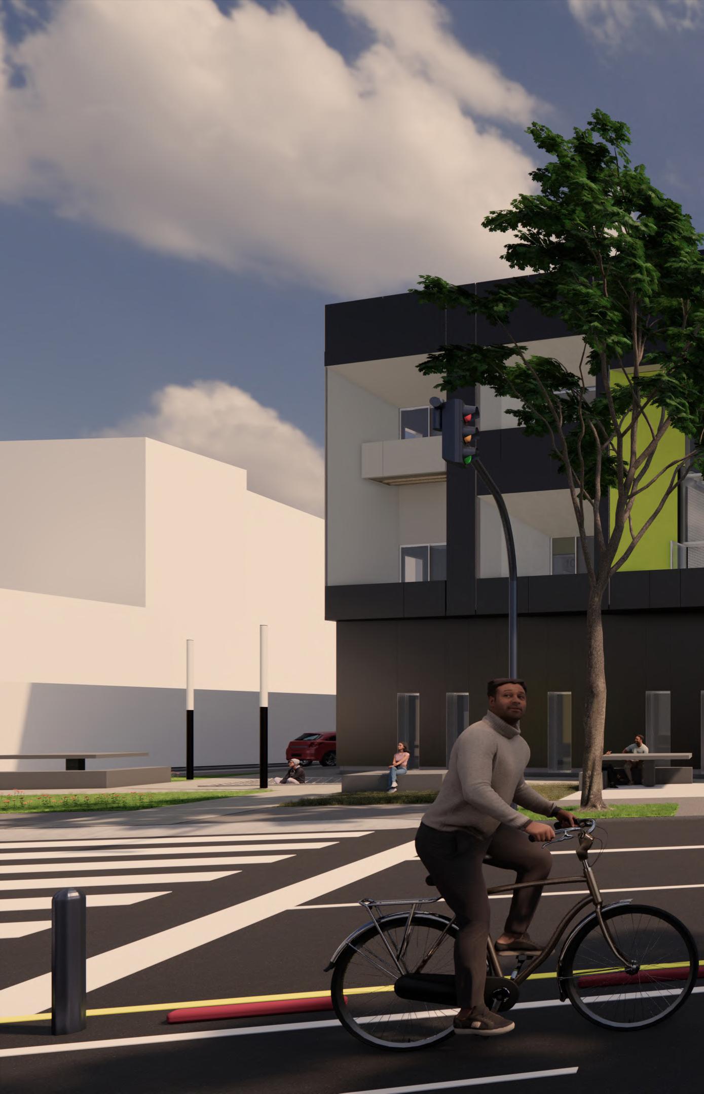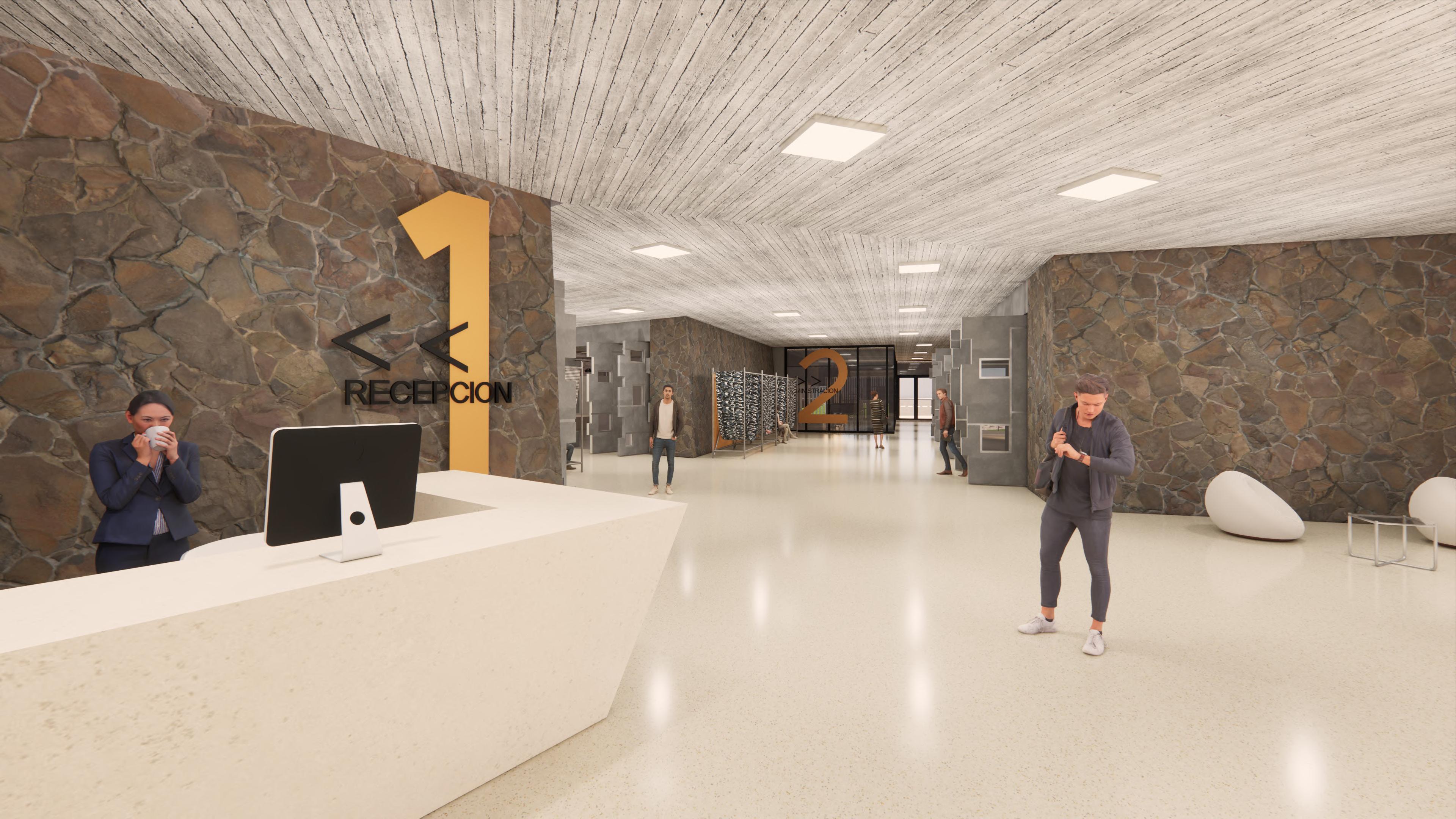 Ante la premisa de liberar al terreno de la huella del edificio lo màs posible para ampliar el uso pùblico del espacio exterior, se decide romper con la lìnea de fachadas contìnuas de la calle estableciendo 2 bloques prismàticos exentos de distintas alturas, uno de secciòn cuadrada girado sobre el terreno de forma perpendicular al sol y otro con forma de trapecio rectàngulo paralelo a la lìnea de la calle, que contienen el co-working y el co-living respectivamente. Ambos mantienen la misma materialidad y resoluciòn de detalles de fachada. El nexo entre ambos volùmenes exentos es un puente que los conecta estableciendo un nuevo uso al programa y de caràcter pùblico que es un cafe, posicionandose como un hito para la zona.
