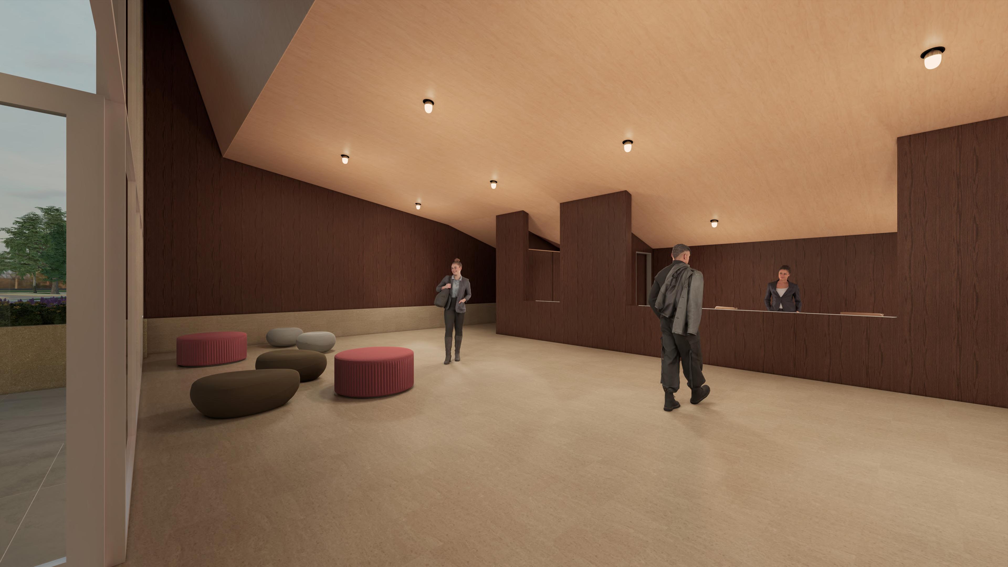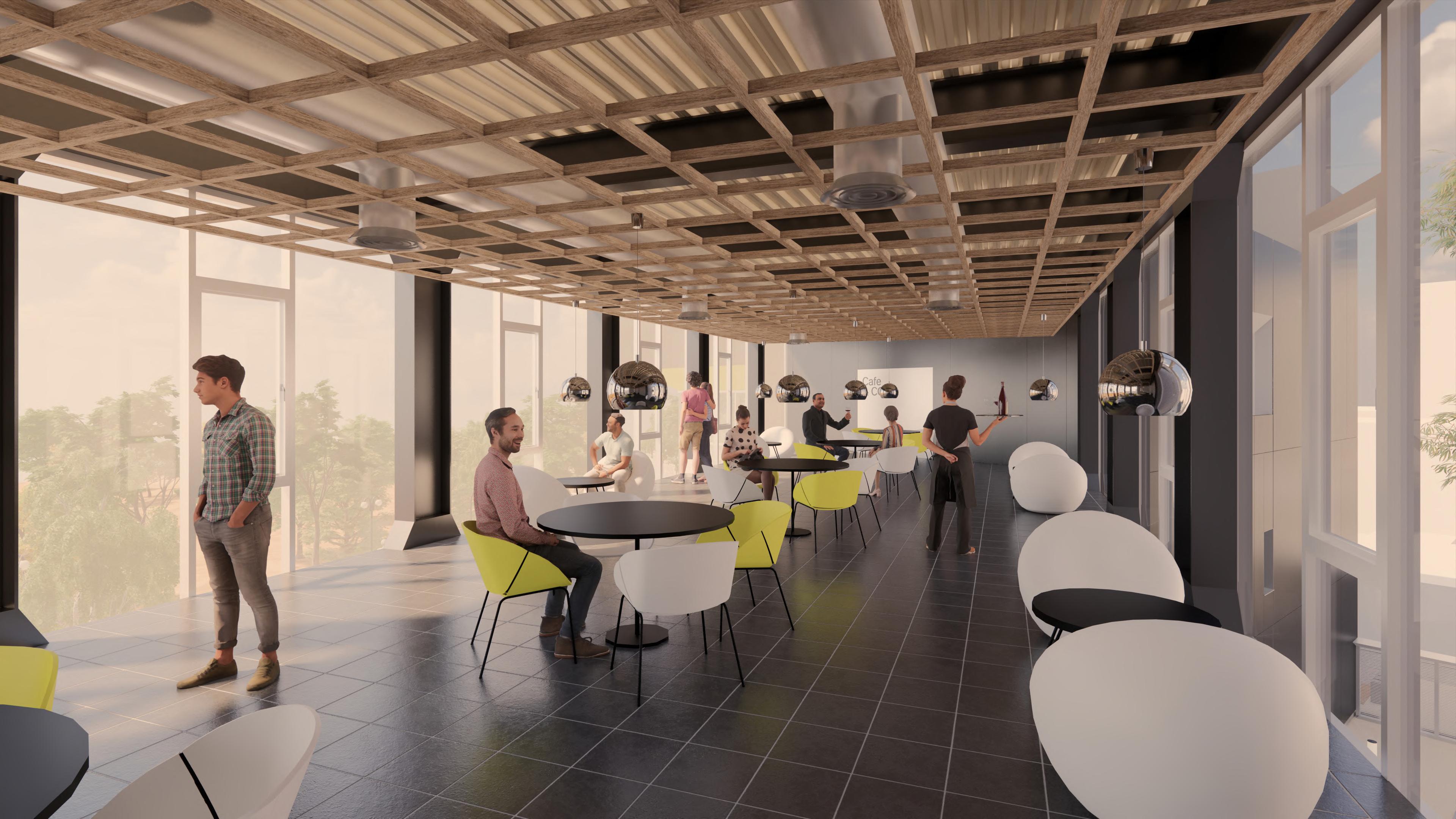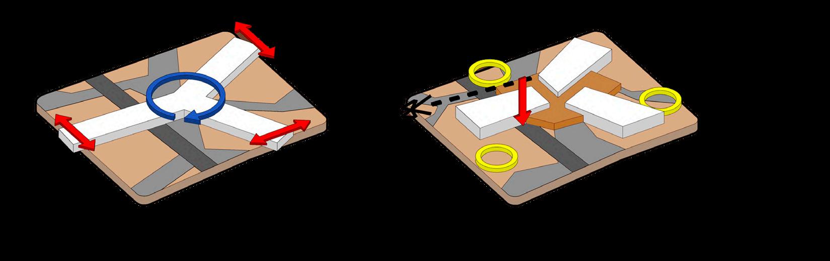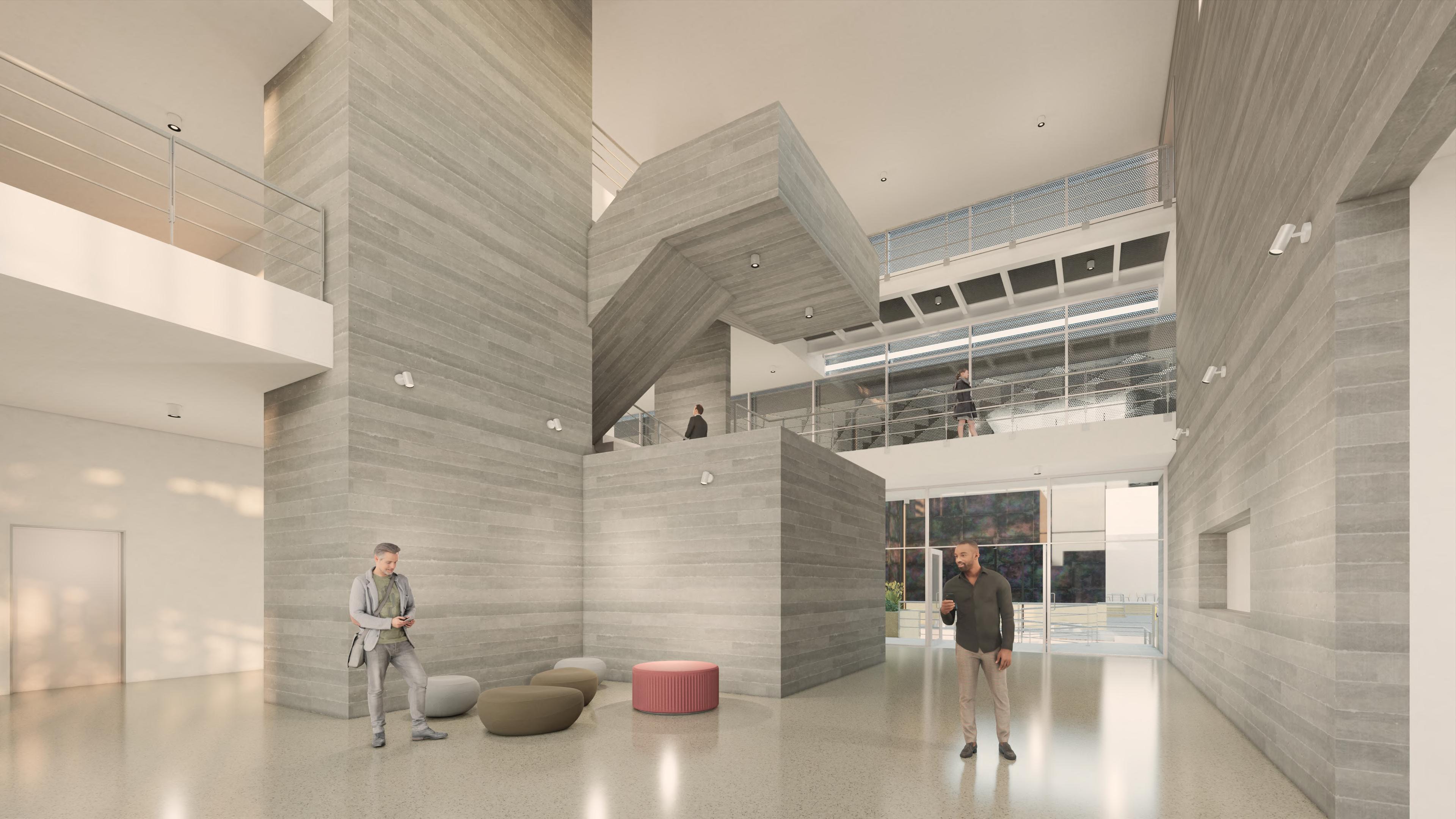 Ante la premisa de liberar al terreno de la huella del edificio lo màs posible para ampliar el uso pùblico del espacio exterior, se decide romper con la lìnea de fachadas contìnuas de la calle estableciendo 2 bloques prismàticos exentos de distintas alturas, uno de secciòn cuadrada girado sobre el terreno de forma perpendicular al sol y otro con forma de trapecio rectàngulo paralelo a la lìnea de la calle, que contienen el co-working y el co-living respectivamente. Ambos mantienen la misma materialidad y resoluciòn de detalles de fachada. El nexo entre ambos volùmenes exentos es un puente que los conecta estableciendo un nuevo uso al programa y de caràcter pùblico que es un cafe, posicionandose como un hito para la zona.