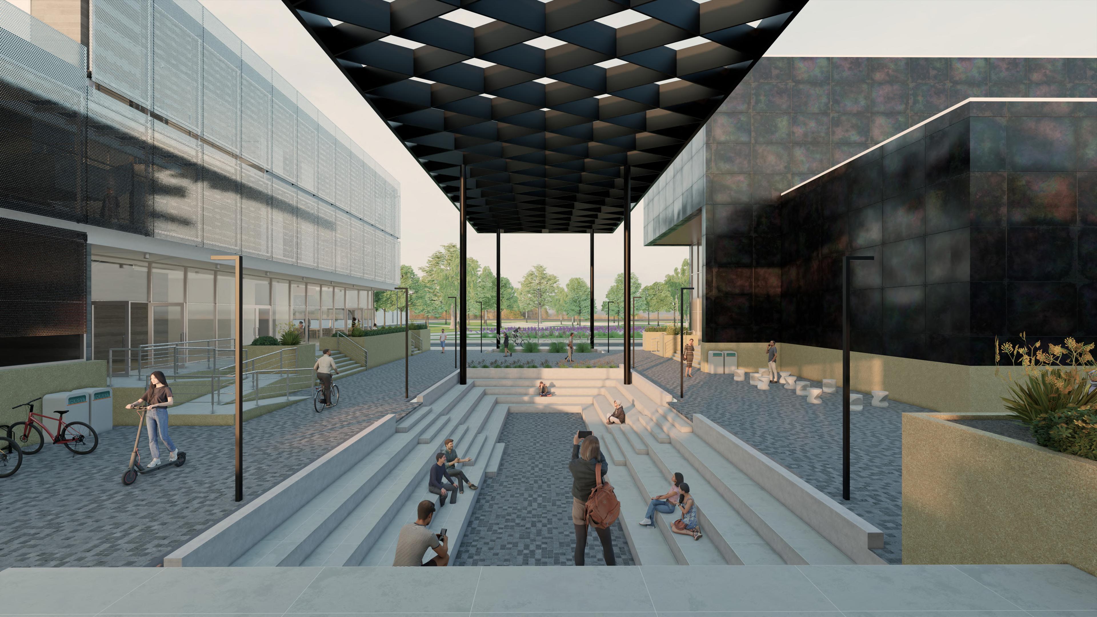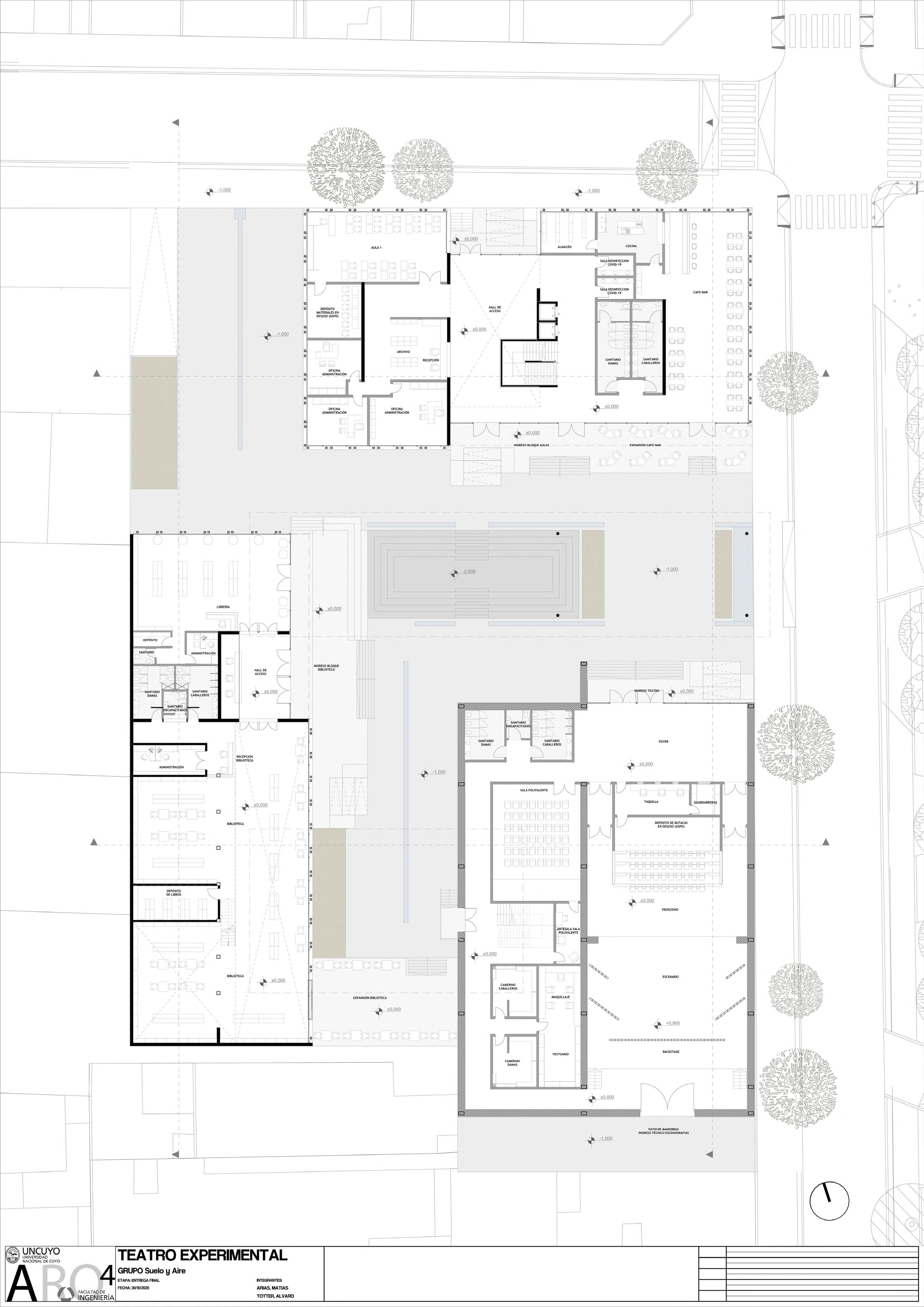 El proyecto debía estar encabezado por un teatro junto con otro uso propuesto a libre elección. Del análisis de la zona se decide compatibilizar el uso cultural del teatro con otros de carácter educativo, ya que este uso convocaría a una nueva población antes inexistente para la zona y diversificaría los servicios que garanticen una buena apropiación del sector. Este uso educativo se materializa en aulas de usos múltiples para la enseñanza, con todas sus instalaciones, y una biblioteca abierta al público. El programa completo (teatro, aulas y biblioteca) se distribuye en 3 edificios independientes cuyos ingresos son vinculados visual y funcionalmente mediante una gran plaza, que les antecede a modo de un hall urbano y sirve como recurso para distribuir en el terreno la propuesta del programa sin caer en la idea de concentrar todo en un edificio único y compacto. Esta plaza cuenta con servicios públicos exteriores para todo aquel que quiera hacerse de su uso pero principalmente esta destinado a los usuarios que concurran a los edificios. Entre lo que propone el espacio público se encuentran parquímetro para bicicletas, sectores de mesas, asientos y, como el punto que más resalta aquí, un sector de gradas hundidas respecto al nivel de la vereda para diversos usos. Algunos de los sectores exteriores son resguardados por pérgolas para crear espacios de sombra y lugares exteriores con mayor confort.
