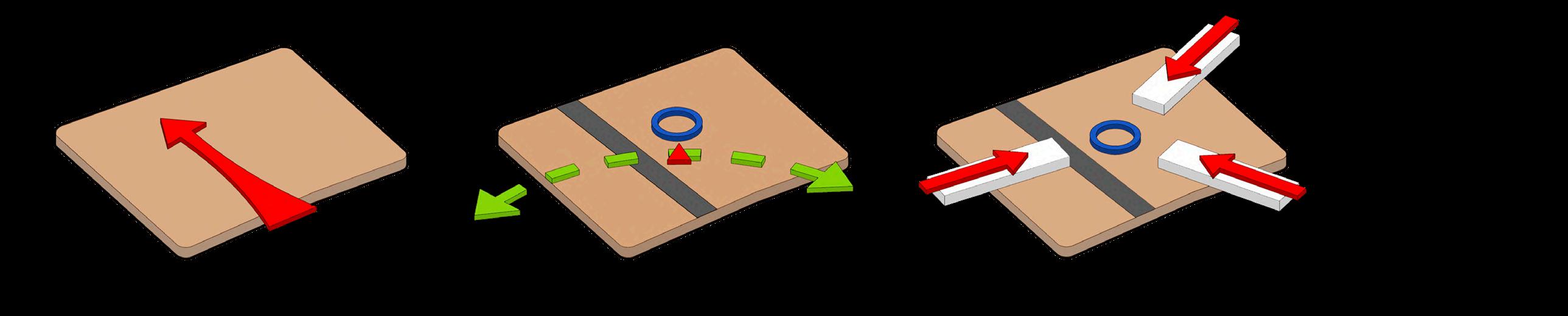 La premisa central es concentrar la oferta cultural en 3 naves industriales de igual tamaño que se vinculen por medio de un hall que les da acceso y las articula entre ellas. Es asi que en la implantación esto se resuelve disponiendo las naves de forma radial colocando como centro al hall de acceso. Ante esta disposición el centro cultural encierra en la manzana 3 pequeñas plazas públicas a las cuales se les da equipamiento de estancia para visitantes y para vecinos de los alrededores. Entre estas 3 plazas se le da mayor espacio y jerarquía a la que da frente al parque para hacer énfasis en el gesto de recepción del centro. Por otro lado, para darle mayor convocatoria al espacio público y como forma de vincular aun más el centro cultural con el Parque Central se extiende el eje de la calle que desemboca perpendicularmente en el terreno a lo largo de un recorrido que desciende por medio de unas terrazas hasta encontrarse con un café justo debajo de una de las naves del proyecto.