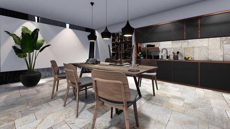 Desain ini cocok untuk kamu yang menyukai konsep rumah yang memberikan kesan warming. Dimana campuran dari material kayu dan warna yang gelap membuat nuansa dapur menjadi lebih sejuk dan eksklusif.