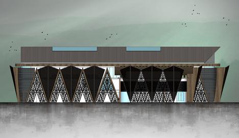Perpaduan bentuk segitiga dan lengkung yang terlihat jelas pada bagian atap serta fasad bangunan Setiap massa bangunan mempunyai bentukan yang mirip karena merupakan hasil sebuah repetisi atau pengulangan Rest area terdiri dari beberapa massa yang tersebar sesuai dengan fungsi dan hasil pen-zoning-an