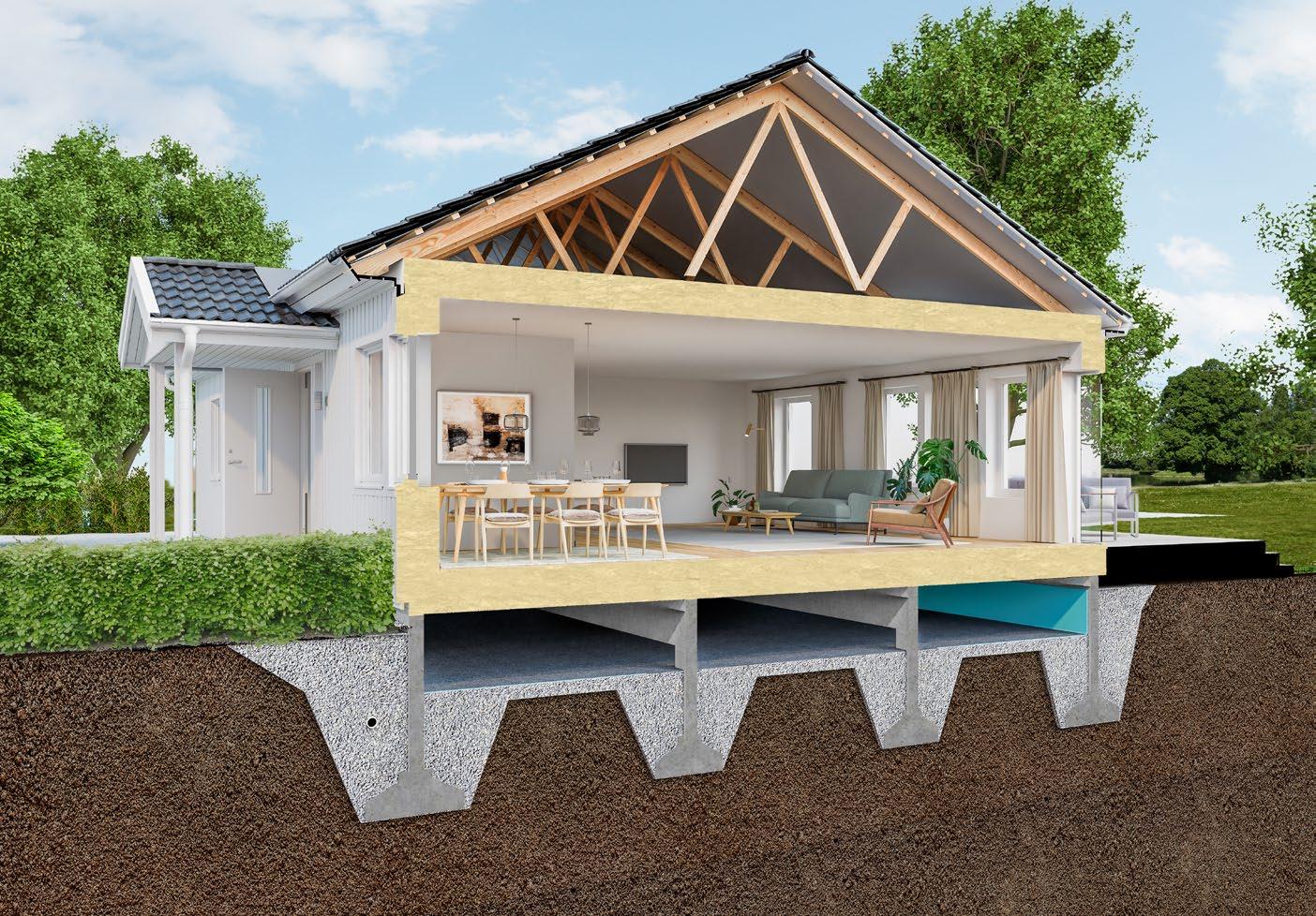 Dessuten kan det drenerte laget under isoleringen enkelt ventileres hvis du bygger på mark med ekstra høyt radonnivå.