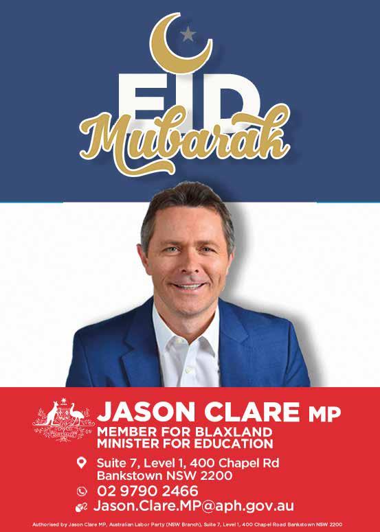 Ph: (07) 3299 5910 jim.chalmers.mp@aph.gov.au www.jimchalmers.org Hoping families in our community enjoyed a blessed Eid al-Fitr EID Mubarak Jim Chalmers MP Federal Labor Member for Rankin Treasurer of Australia BEST WISHES TO YOU AND YOUR FAMILY ON THE OCCASION OF EID UL FITR Lynda Voltz MP MEMBER FOR AUBURN P: (02) 9737 8822 • E: auburn@parliament.nsw.gov.au A: Mezzanine Level, 92 Parramatta Road, Lidcombe NSW 2141 “Authorised by Lynda Voltz MP. Funded using parliamentary entitlements” Eid Mubarak