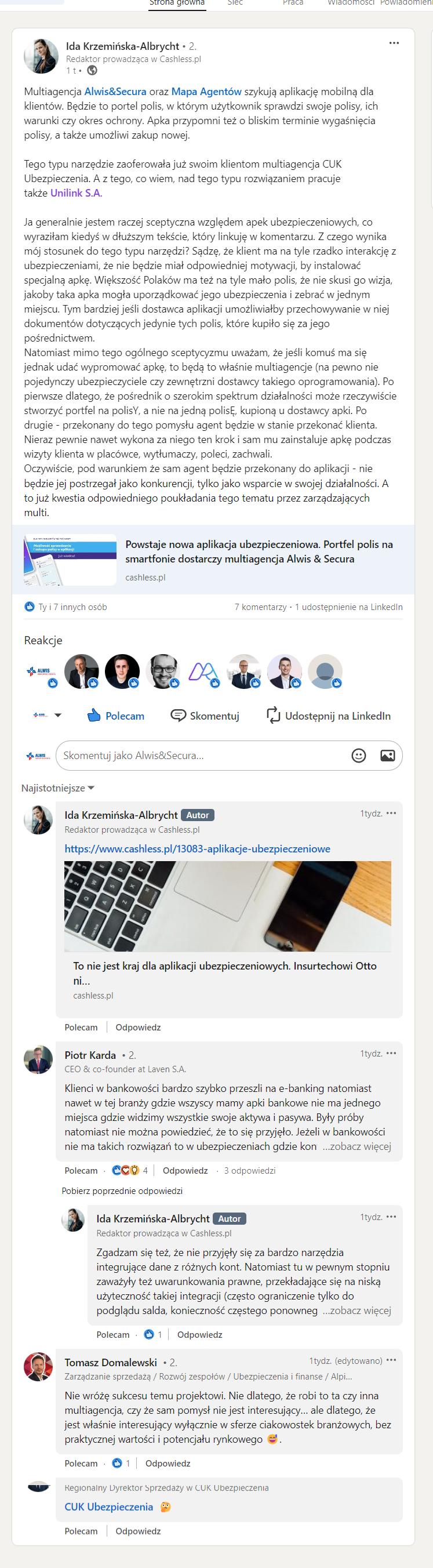 Współpraca z Alwis&Secura pozwoliła mi na rozszerzenie oferty produktowej, nie tylko o produkty majątkowe, ale także życiowe, zdrowotne czy grupowe pracownicze. Dała mi także możliwość uczestniczenia w wielu szkoleniach zawodowych, warsztatach, które organizuje Alwis&Secura dla swoich współpracowników.