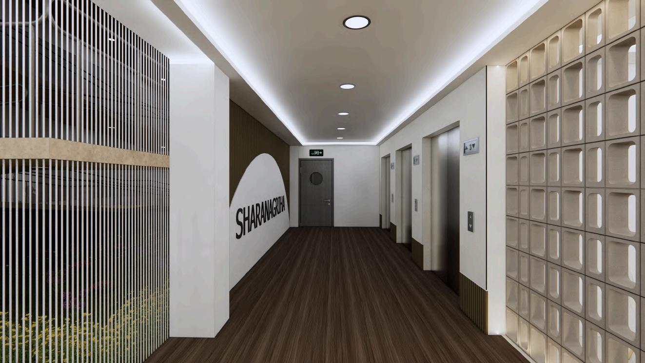 Desain lobi lift untuk fasilitas senior living ini mengutamakan kenyamanan dan keamanan untuk para penghuni lanjut usia. Penggunaan warna netral dan pencahayaan yang lembut menciptakan suasana yang menenangkan. Lantai kayu memberikan sentuhan hangat dan ramah. Fasilitas lift dilengkapi dengan tanda dan indikator yang jelas untuk memudahkan navigasi Penempatan kursi tunggu yang strategis di dekat lift juga memperhatikan kenyamanan penghuni yang mungkin memerlukan waktu istirahat sebelum atau setelah menggunakan lift