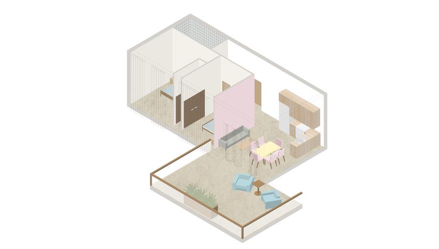 Located south of the Feria de Sevilla, this project relates with its context and facilitates connection between residents with its primary program: cooking. This proposal considers the notion that cooking and eating both act as strong catalysts to bring community members together. Three volumes wrap the north, west, and south sides of the site with the preexisting Restaurante Real Venta de Pilín acting as the fourth volume enclosing a central public courtyard. Ground floor public program is dedicated to market spaces and cooking classrooms, and on the upper floors, community kitchens sit at the end of each volume, providing the space for residents to cook and dine together. A thin, occupiable second skin envelops the three volumes and creates a transparent layer between the public and semi-public world, acting as an operable threshold that merges these two realms together. Units consist of three initial typologies and are fully flexible, allowing for user adaptation or potential combination.