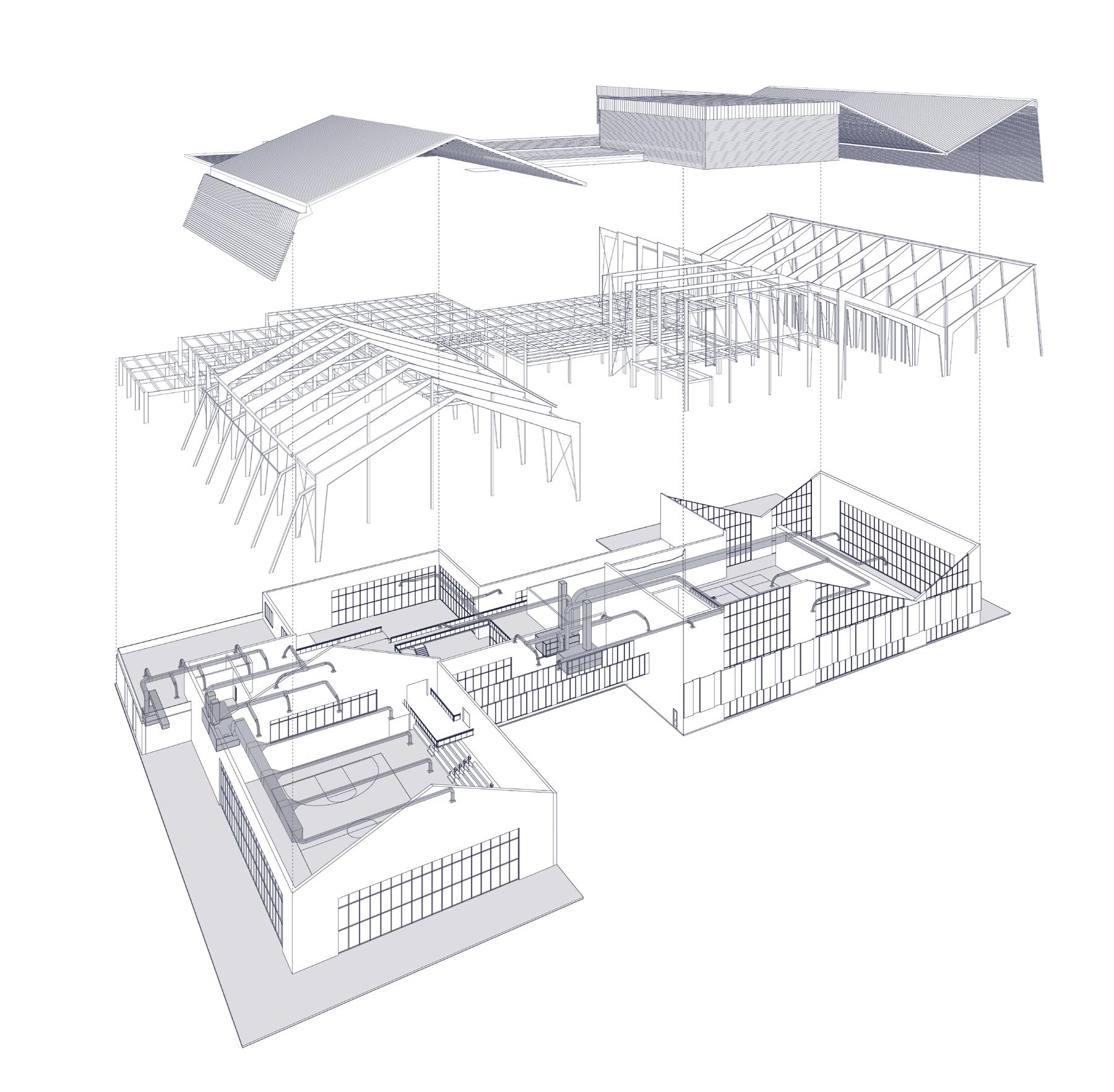 “Inversed” is a pre-engineered metal sports facility on the Rellis Univeristy Campus in Bryan, TX that allows students in this remote part of the campus access to recreational activities. The proposal incorporates tapered columns and beams to span large areas and explores structural versatility throughout the building. The concept of “inverting” the traditional profile of the tapered structure creates distinctive spatial qualities throughout different parts of the program and provides opportunities for rainwater harvesting through its V-shaped roof. The building incorporates various components of metal building systems in new ways, including energy-efficient shading devices made from metal purlins