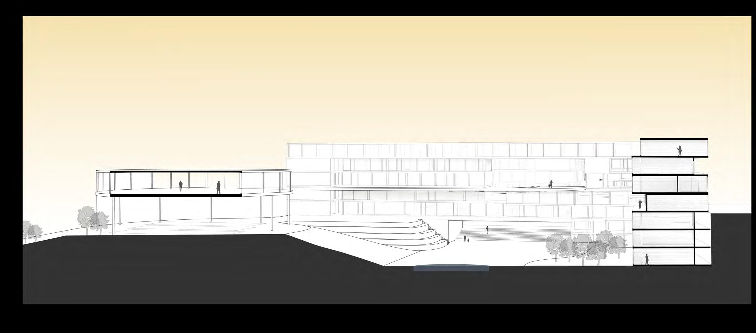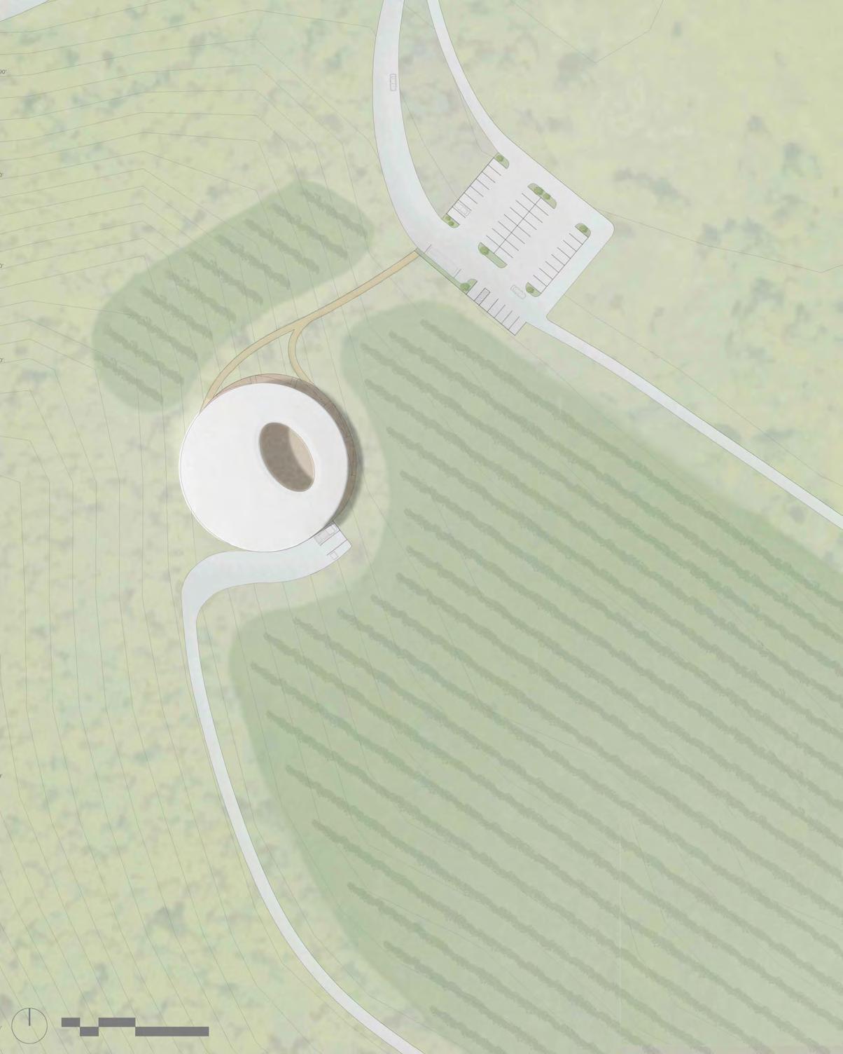 The winding winery is a unique user experience in which the visitor follows a steadily inclining tour path that intersects the route of the grape at crucial points on its journey to becoming wine. The angled roof evokes historical wine caves, as if the ground plane slightly lifted itself to allow for entrance into the structure. As the visitor enters on the ground plane, the floor drops from below them to reveal the expansive wine processing space. This process takes place below ground to take advantage of the cave-like thermal qualities found there. The circular form of the winery represents the cyclical and ordered nature of the wine-making process, additionally creating a powerful connection to the natural and cultural history of the site.
