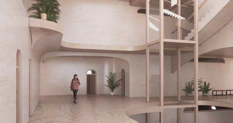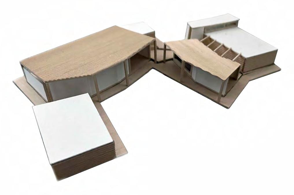 The Brown Property’s future path system is integrated with the building which further encourages the users to explore the nature center. The outdoor gathering space however, is de ned by the surrounding buildings. Angled roofs encourage inward movement, maintaining a sense of community.