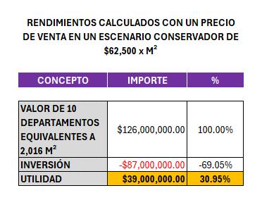 Es importante resaltar que estas utilidades se generan en un escenario conservador con un precio de venta por M² estimado en $62,500.00 cuando hoy en día se han concretado en condominios similares desarrollados por nuestra Firma en operaciones con crédito y avalúo bancario de $78,500.00 por M², que extrapolado a 24 meses se estima en $86,350.00 por M².