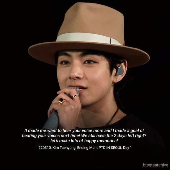 “Alright! yea! I believe we have a large numberofmenpresenttodayaswell.Let'ssee who has the loudest voice. Ladies versus. Gentlemen!No,no,nonotyet!relax!ok?No, not yet. Make some noise, ladies. *women scream* alright, guys, not yet! Relax and unwind.Okay,gentlemen,makesomenoise! *gentlemen screams* make it even louder! Makearacket!Wow,suchadayhasarrived! Thank you for attending our concert and appreciating our performance. Also, please turn on your phones' flashlights and keep themonuntilthefinish."V