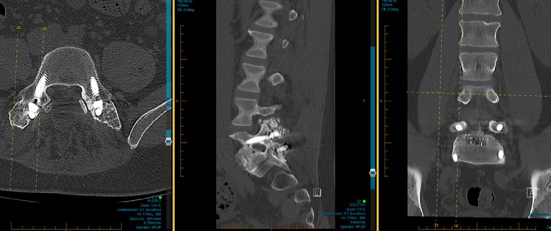 that contribute to spinal stability. In these cases, fusion may become necessary to achieve satisfactory nerve decompression and to reduce the risk of progressive postoperative spinal deformity which could lead to painful symptoms. Besides degenerative conditions, spinal fusion may also be required for stabilisation of the spine due to certain types of spinal fractures, major vertebral tumour resection or certain types of congenital spinal disorders.