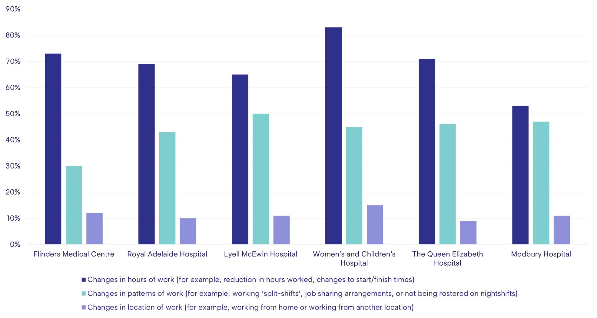 Doctors were asked about the type of flexible working arrangements they would like to, or did, access. Among doctors at the major hospitals who accessed flexible arrangements, between 53% and 83% sought changes in hours worked (such as a reduction in hours, or changes to start and finish times). Job-sharing and other work-pattern arrangements were sought by between 30% and 50% – with all but FMC showing increases in the appeal of these arrangements. Changes in work location were sought by between 9 and 15%, with the highest percentage at the WCH.