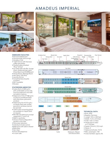 ONBOARD FACILITIES • Panorama-Restaurant • Panorama-Bar and Lounge • Amadeus-Club • “Café Vienna” with Viennese coffee specialities • Outdoor glass-shielded “River Terrace” • Sun Deck with Lido-Bar, lounge chairs, shade awnings, giant Chess Board and Shuffleboard • Fitness Room, Massage Room • Hair Salon, Gift Shop • Laundry Service • Complimentary bicycles on board • Wi-Fi available • Elevator STATEROOM AMENITIES • Suites (26,4 m²/284 sq.ft.) with comfortable corner sofa, luxurious bathroom and walkout exterior balcony • Staterooms (17,5 m²/188 sq.ft.) on Strauss and Mozart Deck with drop-down panoramic windows • Staterooms (16 m²/172 sq.ft.) on Haydn Deck with smaller panoramic windows (cannot be opened) • Cabins with connecting doors are available on Haydn Deck on request • Mini-Bar (all staterooms except categories C-1 and C-4) • Walk-in wardrobe • Choice of bed configuration: double or twin bed • Flat-screen television • Individual climate control • Bathrooms with walk-in shower • Bathrobes • Hair dryer • Direct dial telephone • In-room safe