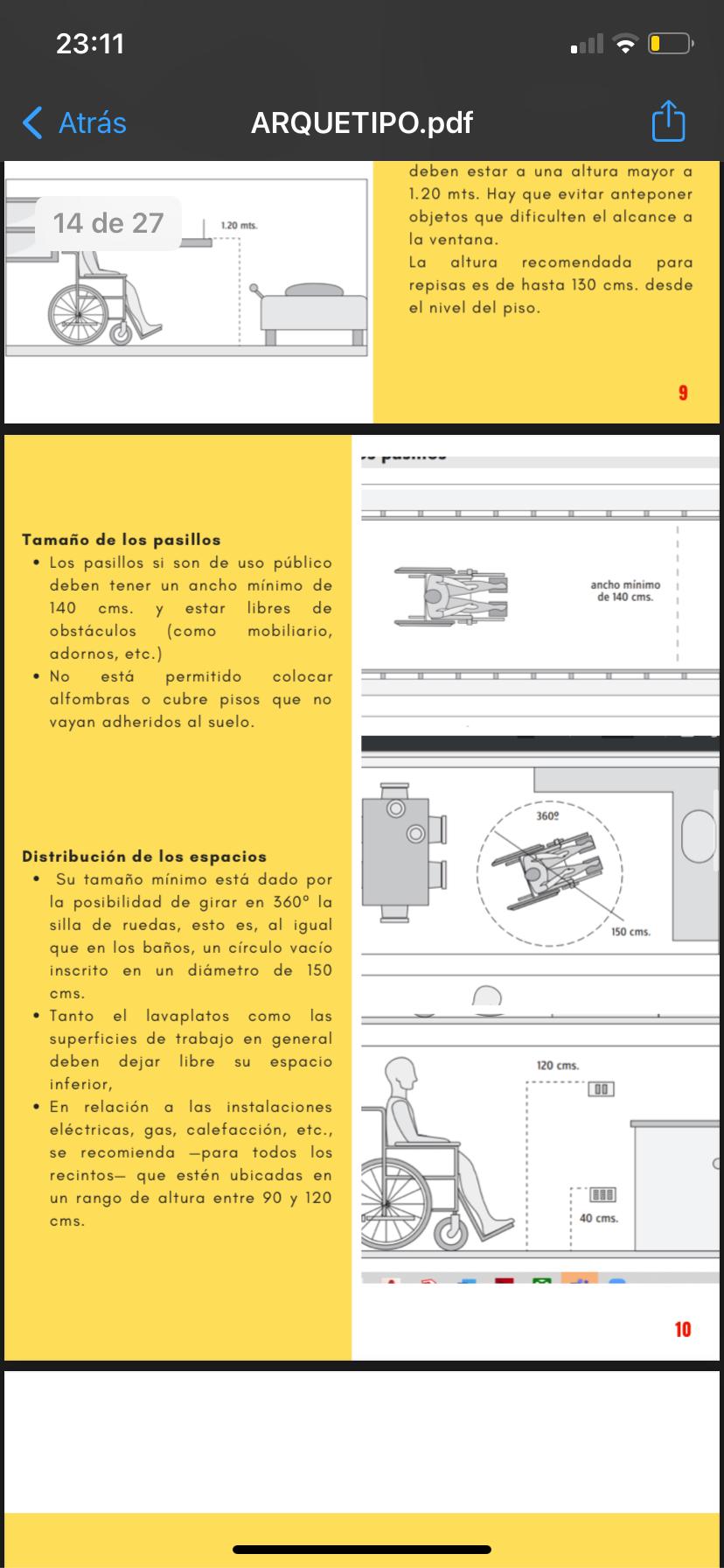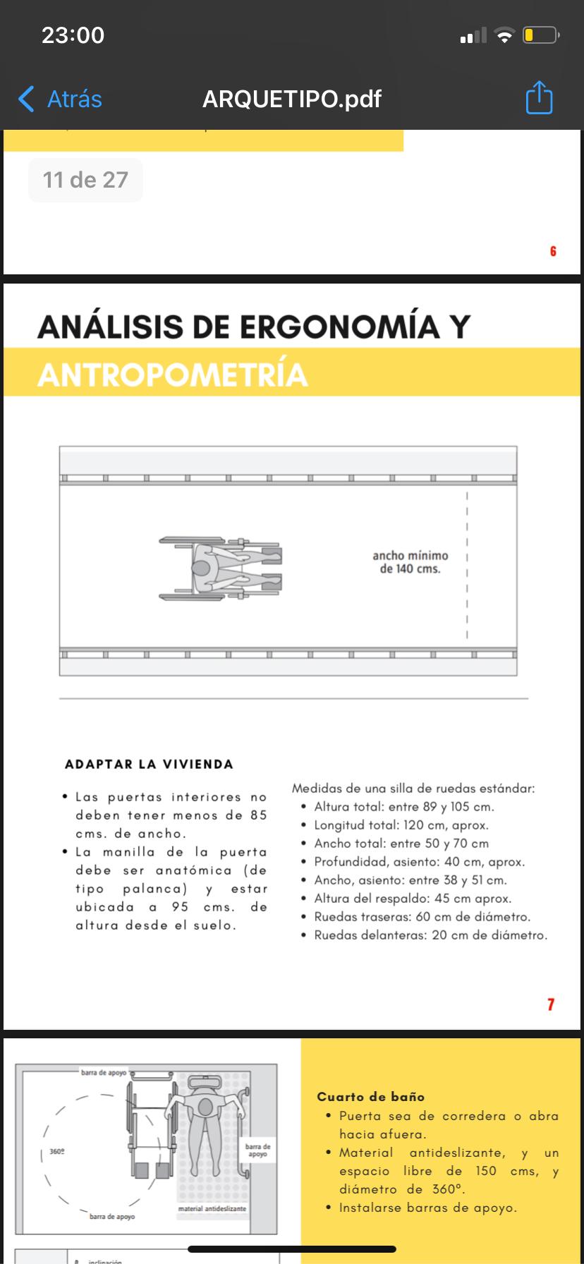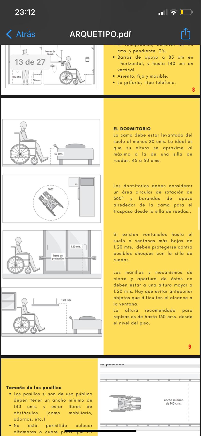 Una persona en silla de ruedas debe poder desplazarse cómodamente e incluso independiente. Estos puntos son clave para el correcto desarrollo funcional y psicológico de los cuales es responsable en gran parte el arquitecto. El uso normativo de las medidas para un usuario en silla de ruedas son el aspecto básico para el mejoramiento del área. El fácil acceso de la persona a cualquier parte de la casa y a las zonas de estar (incluyendo el mobiliario) son de suma importancia proyecto.