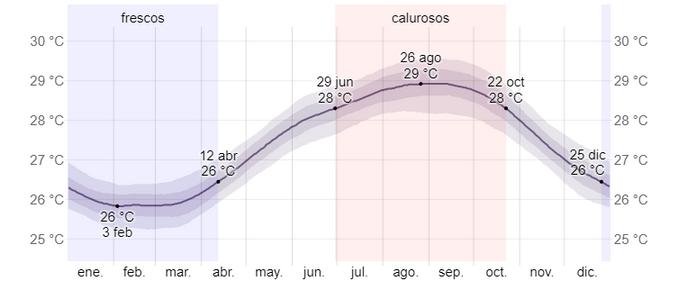 La temporada de aguas cálidas dura 3,8 meses, del 29 de junio al 22 de octubre, y su temperatura promedio es superior a los 30 °C. El mes del año en Isla Mujeres con la temperatura del agua más cálida es agosto con una temperatura promedio del agua de 29°C. La temporada con agua más fresca dura 3,6 meses (25 de diciembre al 12 de abril), y la temperatura promedio alrededor de 30 °C. Siendo el mes más frío, febrero con una temperatura promedio del agua de 26 °C.
