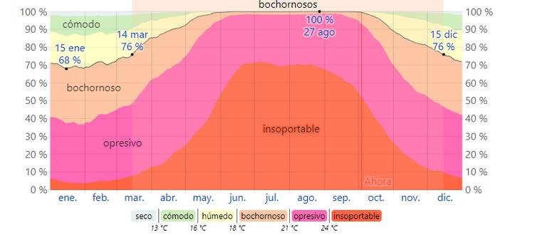 La humedad percibida varía significativamente en Isla Mujeres. La temporada severa dura 9,0 meses, del 1 de marzo al 15 de diciembre, y durante los cuales el nivel de comodidad es insoportable, opresivo o insoportable por lo menos en 76 veces. El mes más lluvioso en Isla Mujeres es agosto con 31.0 días o peor. El mes con menos días húmedos en Isla Mujeres es febrero con 19.8 días o peor.