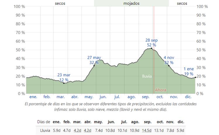 La temporada más mojada dura 5,3 meses, de 27 de mayo a 4 de noviembre, con una probabilidad de más del 32 % de que cierto día será un día mojado. El mes con más días mojados en Isla Mujeres es septiembre, con un promedio de 14,5 días con por lo menos 1 milímetro de precipitación.