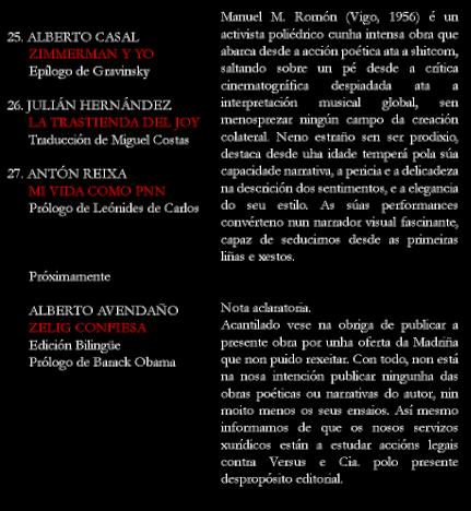 ó remate, sen volta atrás posible; un libro, digo, e a ver se me aclaro, que é, como dicía, un concerto… «mudo», por dicilo dalgunha maneira, que hai que experimentar (con ese oído interior que todos levamos dentro) de pe a pa, para que os 48 pratos (con gornición) dos que consta o menú, debidamente destripados, despezados e esmiuzados polo autor, poidan conformar un festín do que ninguén saia en ningún caso empachado. Ós que cheguen a ese punto espéralles algún que outro descubrimento que non imos desvelar agora.