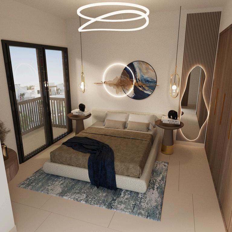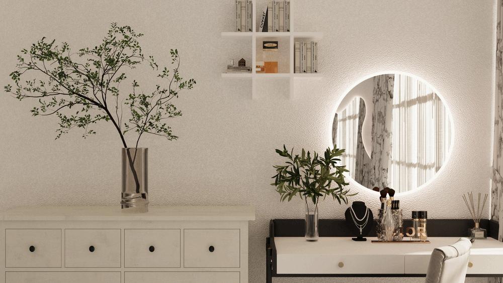 Incorporating an organic-shaped mirror and accent lighting into your bedroom design can add both visual interest and functionality.