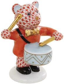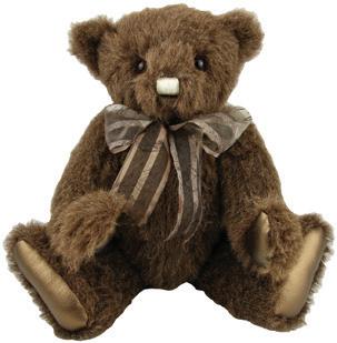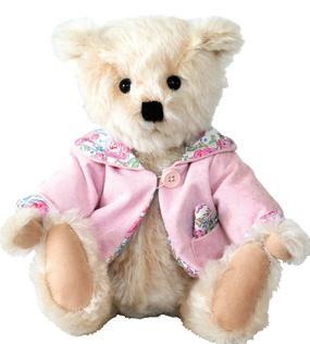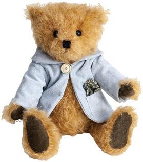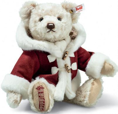 Made of finest cream mohair, hand stitched brown nose and embroidered paw pads, this years musical bear plays "The Christmas Song", chestnuts roasting on an open fire. His deep red wool duffle coat has woven plush trims, a lined hood and wooden toggle buttons.