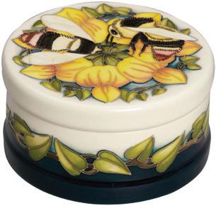 RSPB Rainham Marshes is committed to saving the rarest bumblebee in England and Wales, the Shrill Carder bee, now nesting in its tussocky grassland. This design on a round lidded box, provides a rare aerial view of the Shrill Carder bee, with wings open and nipped back, as they feast on the mustard-yellow claws of bird’s-foot trefoil, showcasing their pale grey-yellow colouring, black band of hair between their wings and unusual reddish-orange tail.