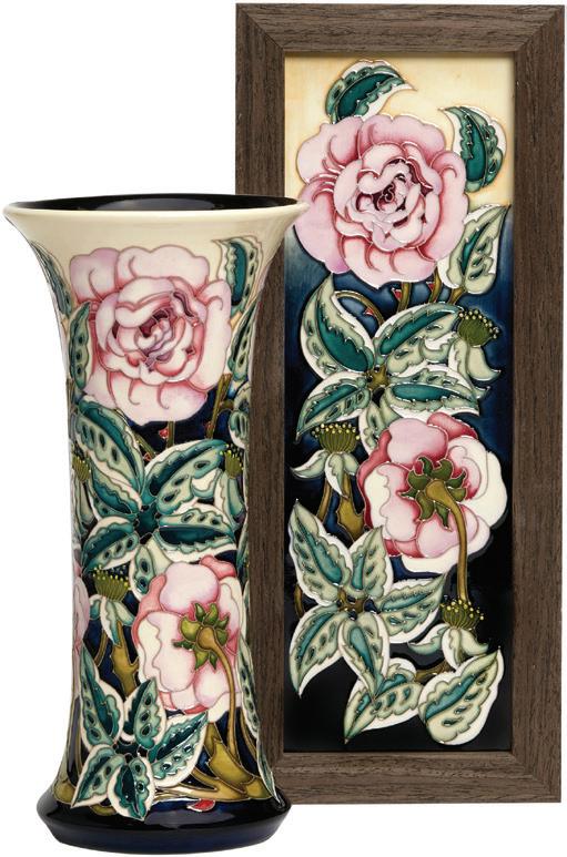 In 2018, a wallpaper fragment, identified by a tax mark, and produced around 1809, was discovered in the Dining Room of Jane Austen’s home in Chawton. Emma's inspiration for her Chawton Rose plaque and vase, was the reproduction block-printed paper, known as Chawton Leaf. Here blush-pink roses are woven amongst the exciting find of the nettle-green leaves.