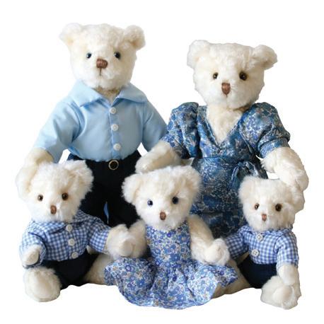 All five exquisite bears are made of luxury white mohair, with soft ivory ultra-suede pads and paws and are 5 way jointed. Their English hand blown glass eyes mirror the colours of the royal family and have hand-embroidered noses in a soft fawn thread. Each bear is fully dressed in an outfit inspired by their royal counterparts. Like many of their family portraits they are dressed in complementary soft blue hues crafted from fine cottons; with both Princess Kate and Princess Charlotte dressed in iconic Liberty prints.
