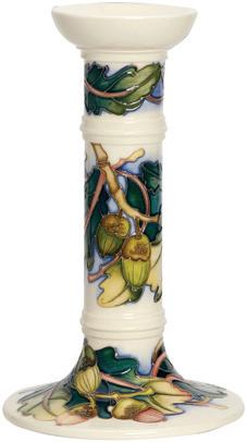 Jane Austen’s friend Martha Lloyd lived with Jane, Cassandra and Mrs Austen for many years. Martha’s manuscript contains not only recipes for food but also recipes for useful household items such as the receipt for ink. Iron Gall ink is one of the oldest forms of ink known to man. The galls of the oak tree contain gallotanic acid when crushed, then mixed with water, it creates an ink. Jane Austen’s surviving manuscripts were written in a variety of this home-made iron gall ink and Moorcroft wanted to pay homage to the writer by creating a design on both an inkwell but also on a candlestick.