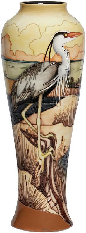 With the vast Dartford bridge in the background, the pensively still Grey Heron with its stilt like legs, takes centre stage in his wetland home on this magnificent vase, whilst over the reeds a flying Grey Heron beats its outstretched wings. This sparse, reed-clustered landscape "intersected with dykes and mounds and gates, with scattered cattle feeding on it" inspired Charles Dickens to write Great Expectations, with Abel Magwitch as one of its major fictional characters.