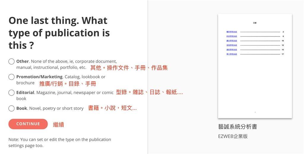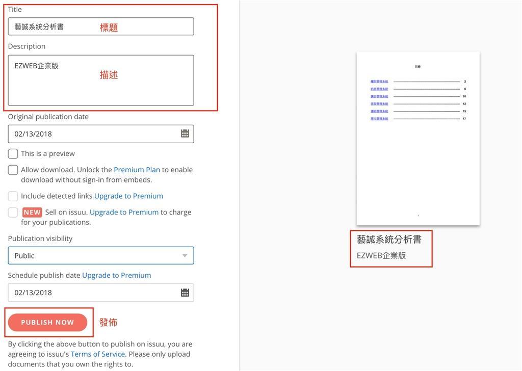 成功後,會看到左側有預覽圖,左手邊可以去制訂電子書標題及描述。按最下方的【PUBLISH NOW】發佈。